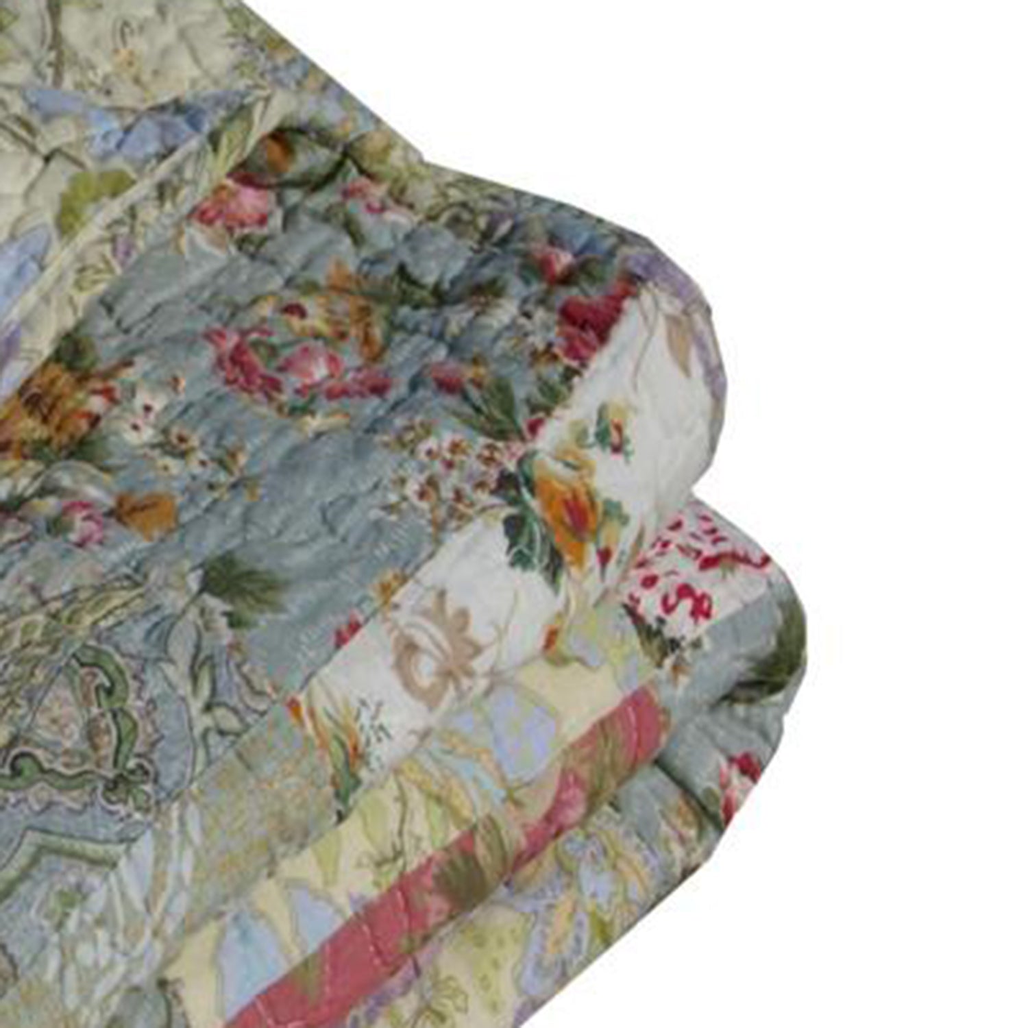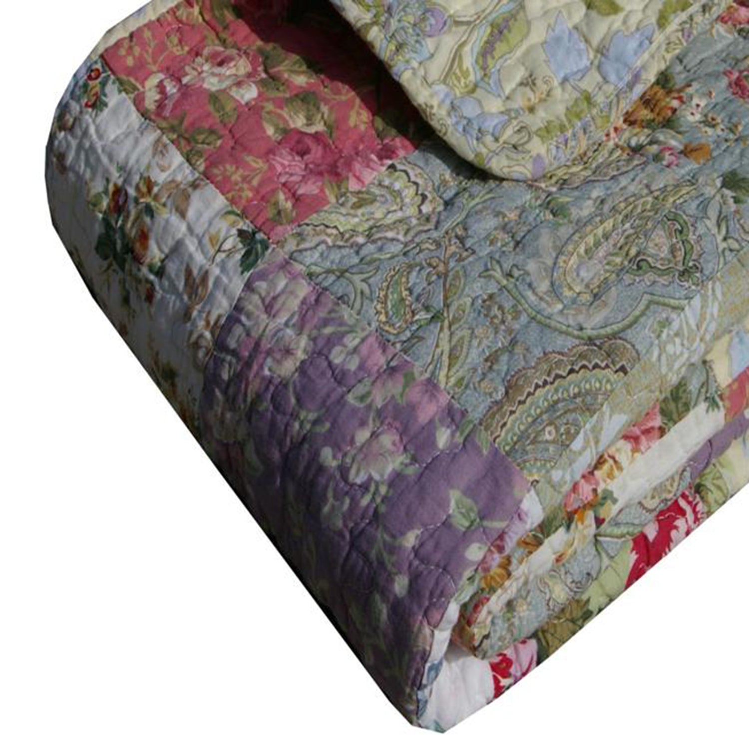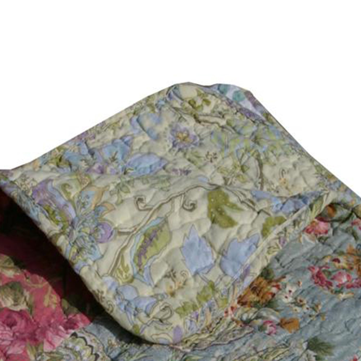 Blooming Prairie spreads a riot of garden colors across your bedroom scene Each quilted fabric block is carefully assembled seamed and finished with fabric bound edges. Framed and reversed to a coordinating striped fabric. Finely stitched for durability and scalloped along the edges. Measures approximately 50x60". Pieced with mitered corners, Fabric bound edges Machine washable