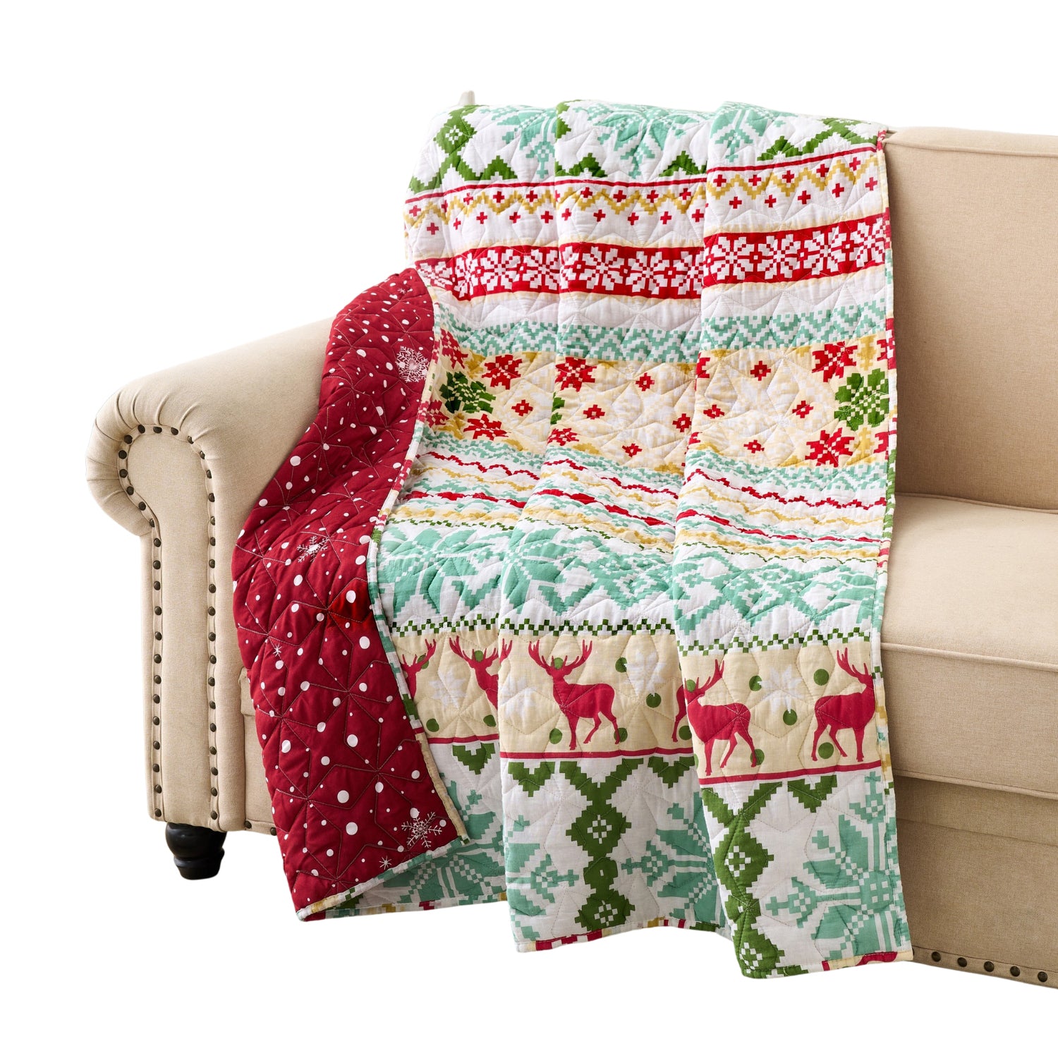 • VERSATILE DESIGN: Featuring traditional Fair Isle motifs in red, green, gold, and turquoise, this throw reverses to a bold snowflake print on red, providing two distinct designs to match festive celebrations or everyday winter home accents.