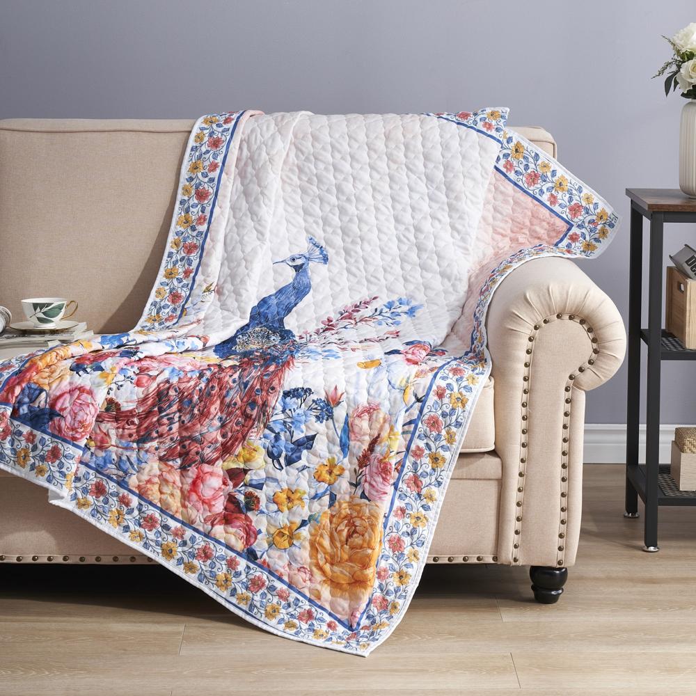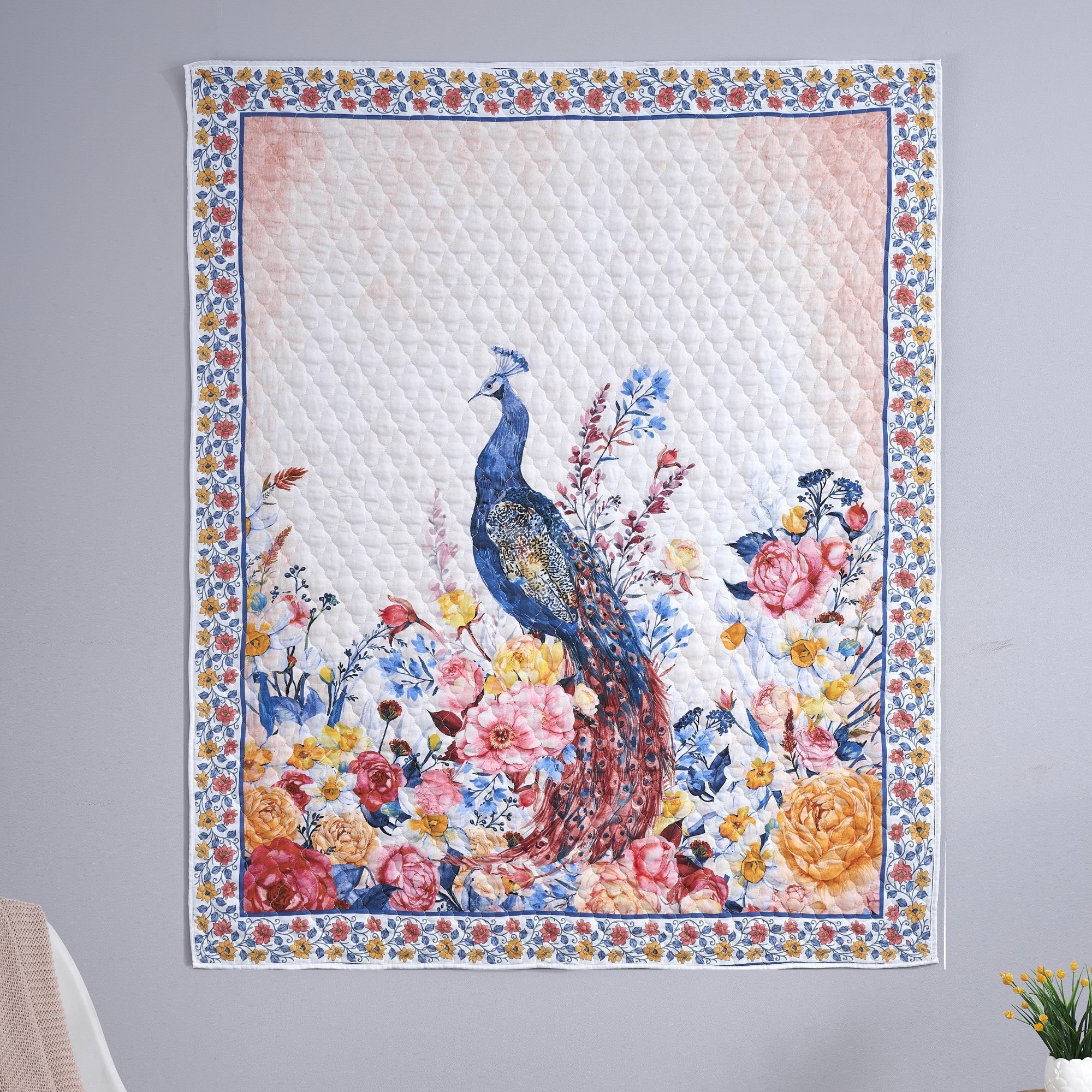 Bring the dramatic beauty of a peacock in its garden home with the Huntington quilted throw blanket. Bordered by scrolling florals in a cheerful color palette of blue, red and gold, the Huntington quilt adds vintage bohemian style to any room. Quatrefoil quilting enhances the durability, loft and beauty of each . Also makes great wall art. Machine Wash. 100% microfiber polyester face and back with 100% polyester fill, prewashed for extra softness and comfort. . Available size - 50x60". Color: Gold.Huntington Peacock Garden Throw Blanket - 50x60", Gold The perfect quilt for your favorite chair or sofa, also makes a decorative wall hanging Add vintage bohemian style to any room with the Huntington quilted throw Machine washable. 100% brushed microfiber shell with 100% polyester fill
