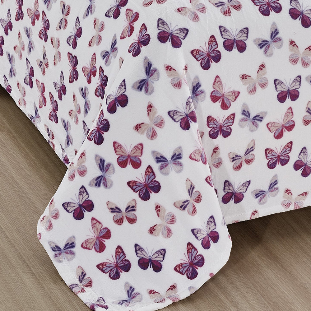 Plazatex Luxurious Ultra Soft Lightweight Rose Butterfly Printed Bed Blanket White/Purple