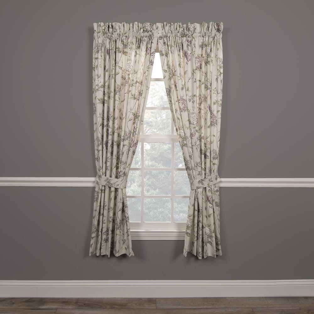 Ellis Curtain Abigail 2-piece window rod pocket pairs with ties is a multi colored traditional Hydrangea floral print pattern on solid natural colored ground that features a range of shades and colors that coordinate easily with a variety of solids and patterns within your home. This traditional curtain panel set is lined with solid color fabric for increase privacy sun protection and also maintain room darkening. Each curtain panel is constructed with a 1.5-inch rod pocket decorative 2.5-inch header and 3-inch bottom hem. Width is measured overall 90-inches. Length is measured overall 63-inches from top stitch to bottom of panel and includes two standard tiebacks. Dimension: 90" x 63". Made from 52% Polyester/48% Cotton Duck that creates a smooth and soft draping effect. Available color is Lilac. Care instruction: Easy care - Machine Wash - Dry.2-piece high quality window rod pocket panel pair with 2 ties including 90x63". Lilac color. Made from 52% Polyester/48% Cotton Duck that creates a smooth and soft draping effect. Instantly update your home decor with header and decorative window rod pocket pairs including 2 Tie. High quality polyester fabric pattern design for overall room darkening, privacy and sun protection. Care instruction: Easy care - Machine Wash - Dry.