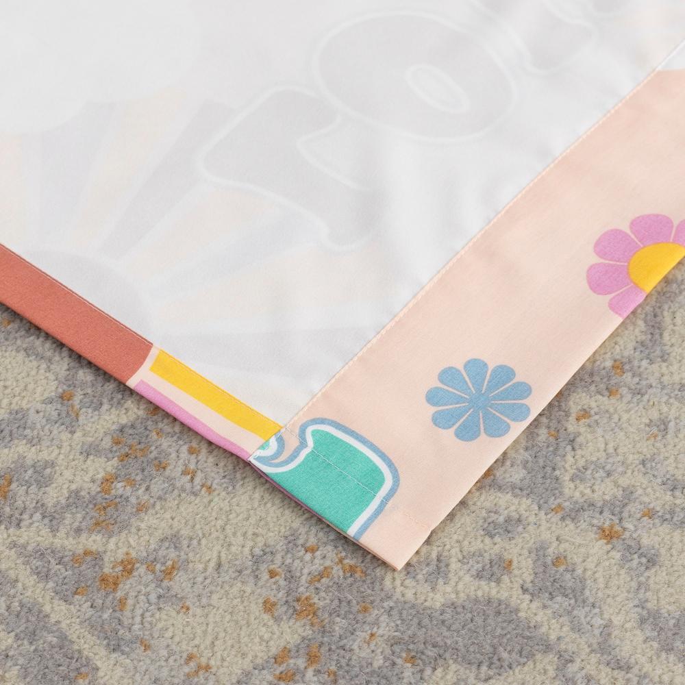 Peace, Hope and Love never go out of style! In a throwback to the \'70\'s, the Cassidy curtain panel pair features rainbows, peace signs, flowers and clouds floating in a peach blossom sky. Each curtain panel set is lined with solid color fabric for increased privacy and sun protection. This 4-Piece set includes two panels and two tie backs. Dimensions: Each panel measures 84 inches long x 42 inches wide (x2). Overall dimensions of set, 84 inches x 84 inches. 100% polyester face, back (2 ply). Three-inch rod pocket fits most curtain rods for hanging Machine wash.Each set includes two panels and two tie backs for generous coverage on any window. Available size: 84x84, Available color: peach Each panel measures 42 inches wide x 84 inches long making the total coverage area of this panel set, 84 inches x 84 inches. Lined for increased privacy and sun protection, with a 3-inch rod pocket that fits most rods for hanging Machine washable