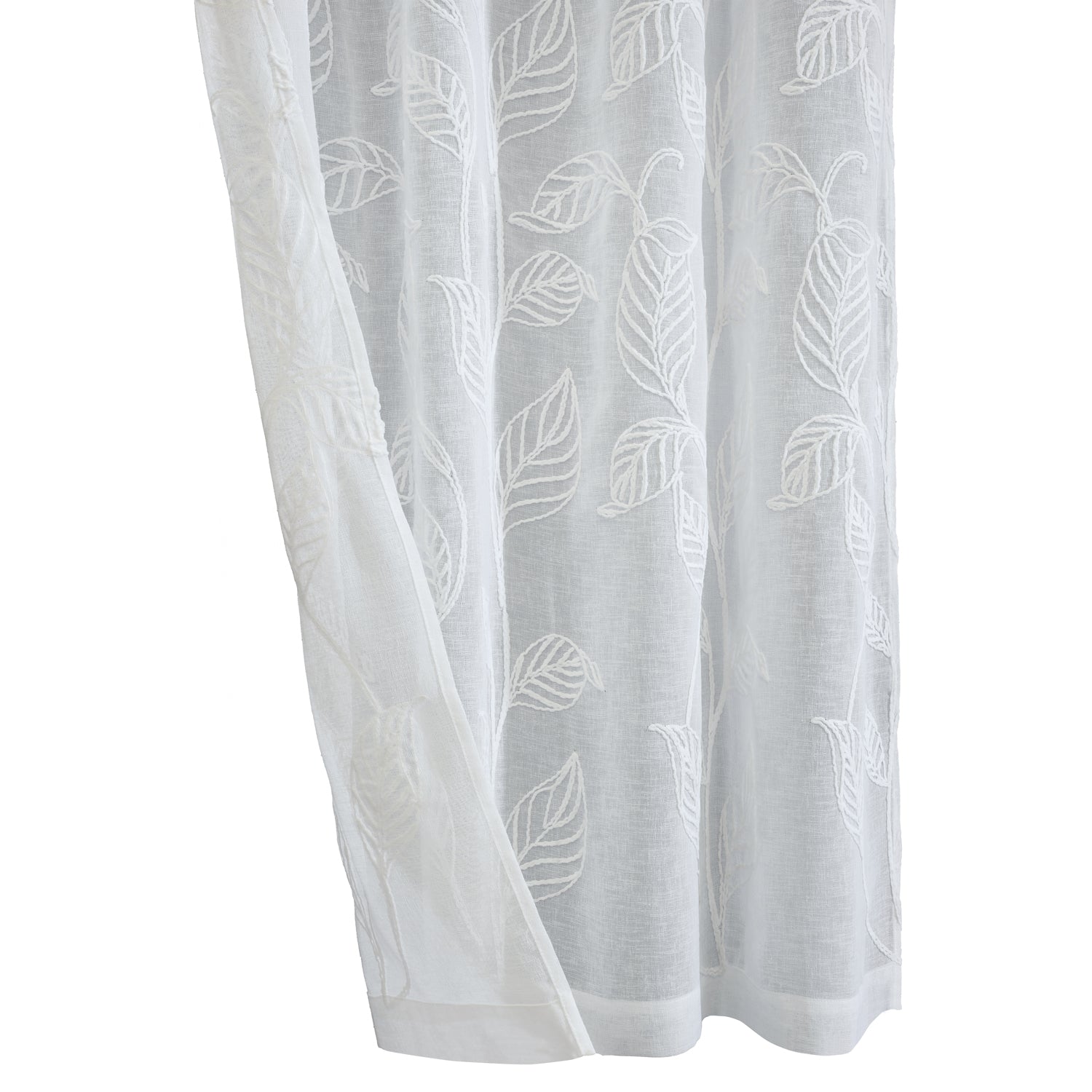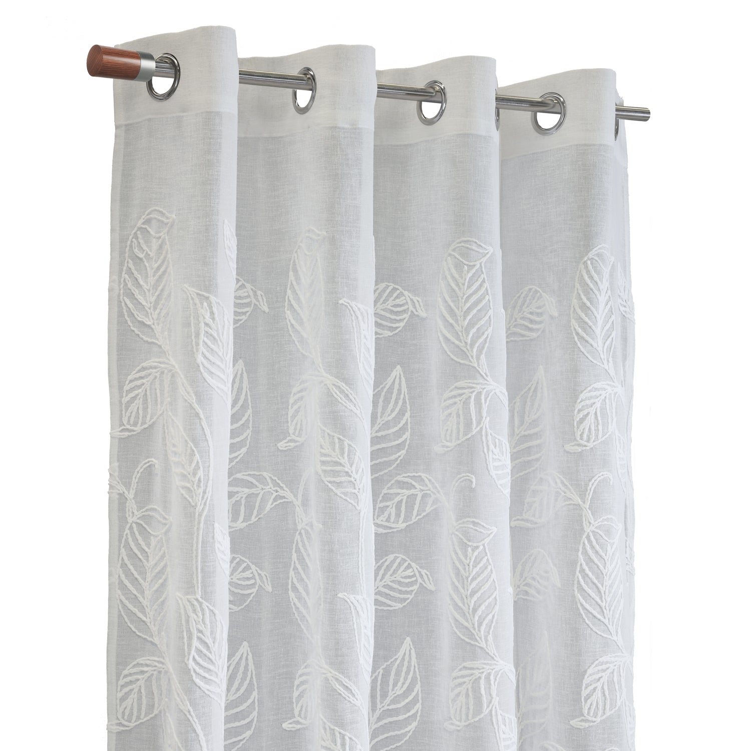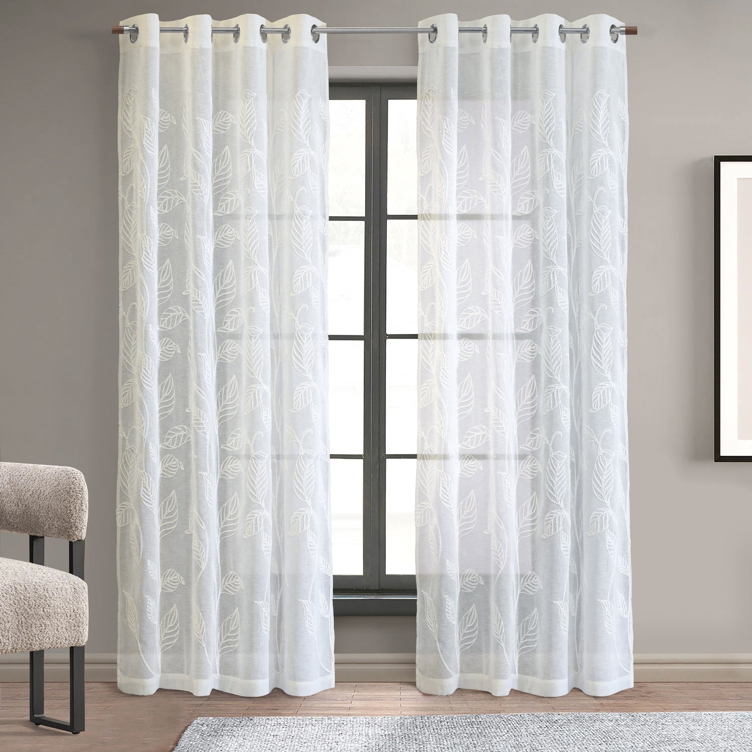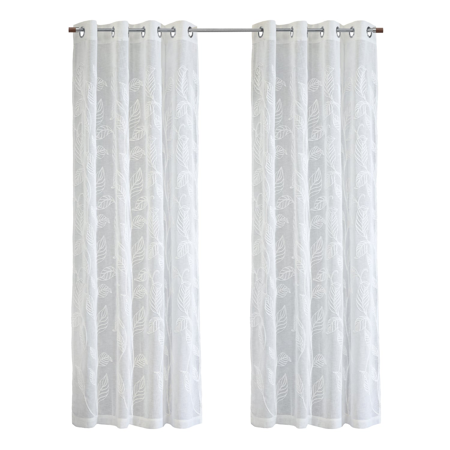 Transform your space with the Lausanne Sheer Grommet Curtain Panel in Off White, sized 52x84 inches. Adorned with delicate chenille embroidered leaves, this sheer curtain blends style and light for a cozy ambiance. Crafted from high-quality 100% polyester, it’s lightweight and machine washable for easy care. The sheer fabric gently filters natural light, offering daytime privacy while illuminating living rooms, bedrooms, or home offices. Its modern, contemporary, or traditional design suits diverse decors. Grommet headers ensure easy hanging and smooth gliding. Use multiple panels (1.5-2 times window width) for fullness. Rigorous quality control guarantees consistent lengths, smooth hemlines, and seamless pattern flow, ensuring a polished, elegant look that enhances any room with sophisticated charm and functionality.CHENILLE LEAF DESIGN: Delicate chenille embroidered leaves add a sophisticated, natural charm, blending modern and traditional styles to elevate any room with a cozy, elegant atmosphere. EASY GROMMET INSTALL: Grommet headers allow quick, hassle-free hanging and smooth gliding, providing a sleek, modern look and effortless operation for stylish, functional window treatments. IDEAL 84-INCH LENGTH: The 84-inch length suits low ceilings or floor-length looks, offering a tailored fit that enhances the aesthetic of any space with a refined, elegant appearance. SHEER LIGHT FILTERING: Sheer polyester gently filters natural light, providing illumination with subtle privacy, creating a bright, inviting ambiance in living rooms, bedrooms, or offices. DURABLE EASY-CARE FABRIC: Crafted from 100% polyester, this lightweight, washable curtain ensures lasting durability and easy maintenance, with a soft, chenille-enhanced texture that drapes gracefully.