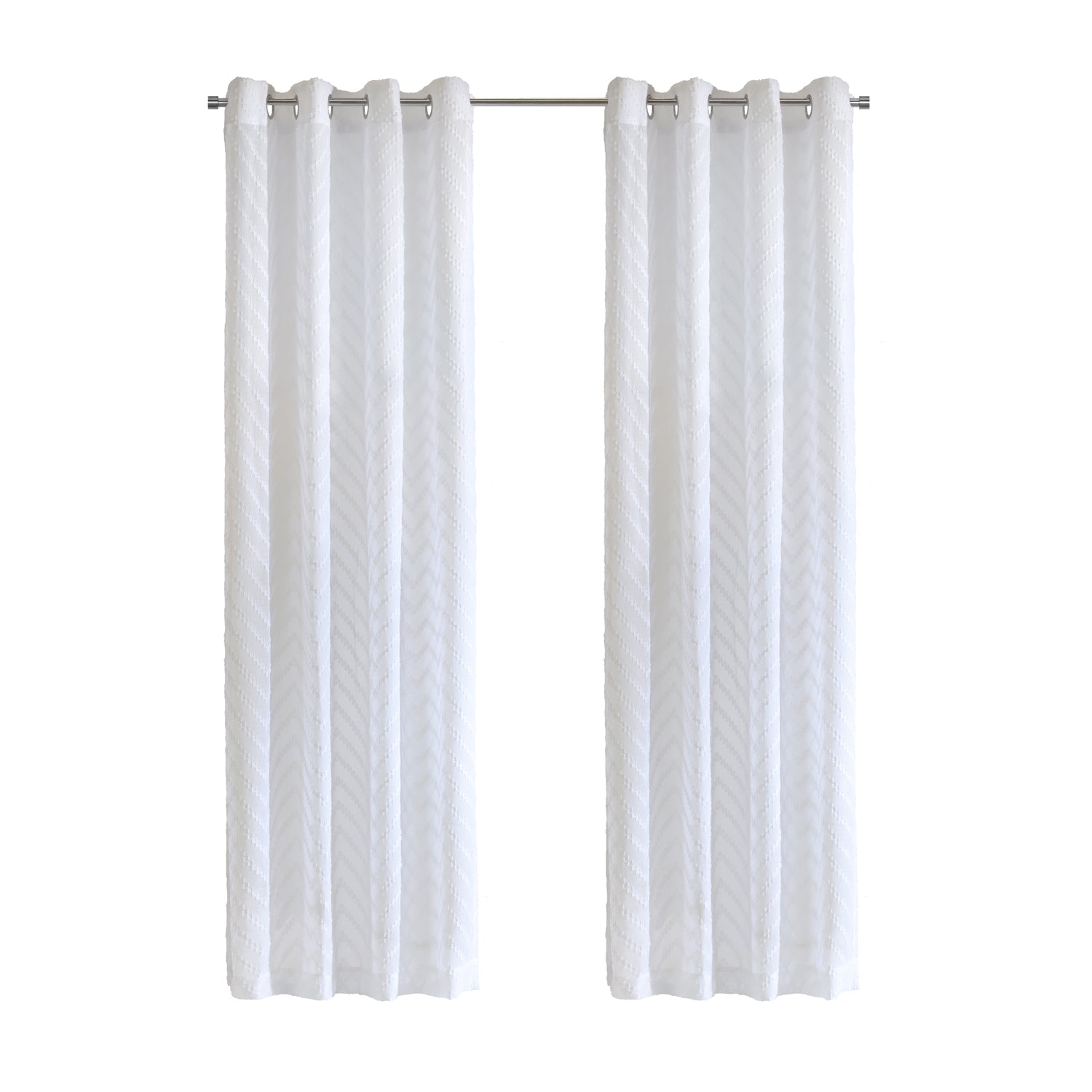 Transform your home with Regina Sheer Grommet Curtain Panels in White, available in sizes 52x63, 52x84, 52x95, and 52x108 inches. Featuring a stylish clipped chevron pattern, these sheer curtains bring modern elegance to any room while allowing natural light to filter through softly, creating a warm, inviting ambiance. Crafted from high-quality 100% polyester, they offer a lightweight, breathable texture that enhances both durability and aesthetic appeal. The grommet header ensures effortless hanging and smooth operation, making them a practical yet chic addition to living rooms, bedrooms, or home offices. Their versatile design complements modern, contemporary, casual, or traditional decor styles. Machine washable for easy care, these curtains maintain their beauty with gentle cycles and hang-to-dry maintenance. Use multiple panels totaling 1.5-2 times your window's width for a fuller look.SHEER LIGHT FILTERING: Sheer fabric softly filters natural light, creating a warm, inviting glow while offering light privacy. Ideal for living rooms, bedrooms, or home offices, it enhances ambiance without blocking natural brightness. EASY GROMMET INSTALL: Grommet headers allow quick, hassle-free hanging and smooth gliding, adding a sleek, modern touch to your windows. Effortless to install and operate, they ensure a stylish, functional decor solution. MULTIPLE SIZE OPTIONS: Available in lengths of 63, 84, 95, and 108 inches, these curtains fit any window size, providing a tailored, elegant look that enhances the aesthetic of both small and large spaces with a perfect fit. DURABLE POLYESTER: Crafted from 100% polyester, these lightweight, breathable curtains are machine washable, offering lasting durability and easy maintenance, ideal for busy households with a soft, graceful drape. CHEVRON PATTERN DESIGN: The clipped chevron pattern adds modern, sophisticated charm, blending seamlessly with casual, formal, or traditional decor, elevating any room with a stylish, versatile aesthetic.