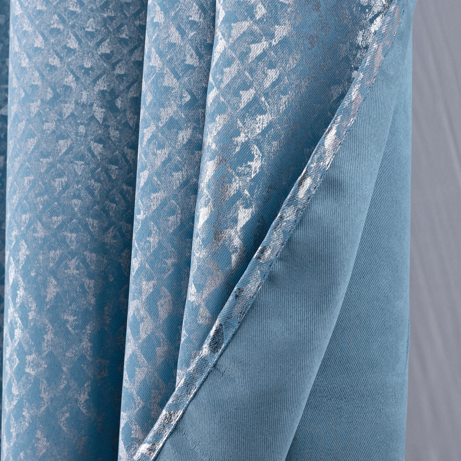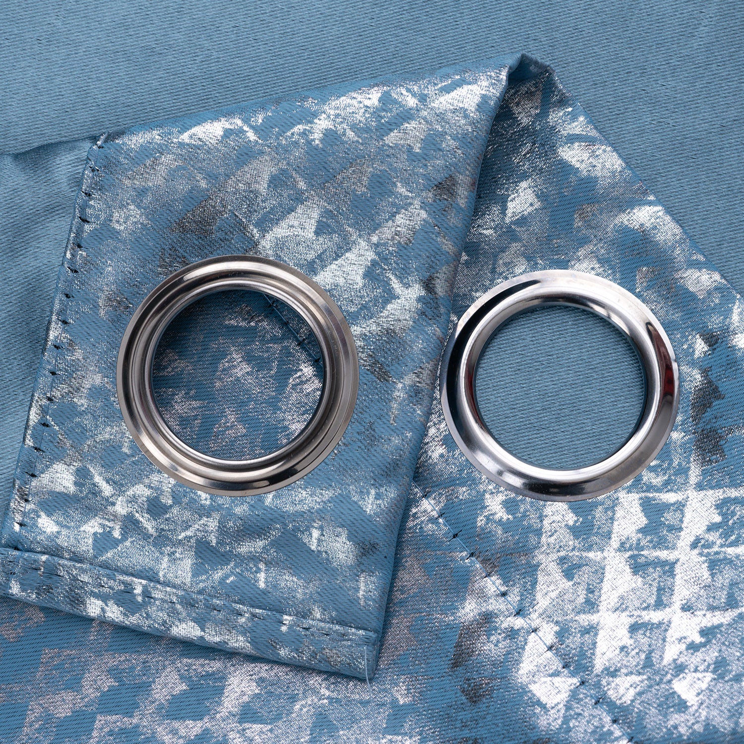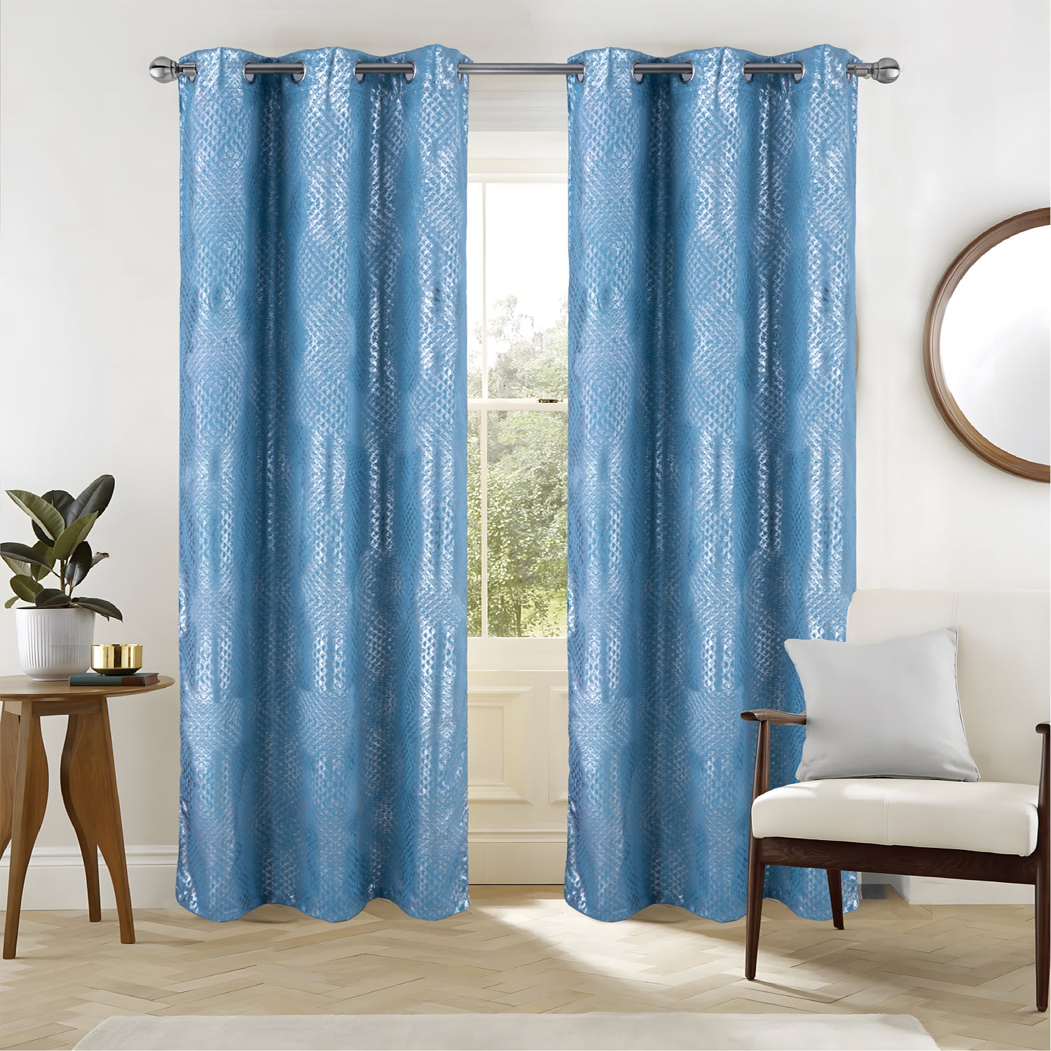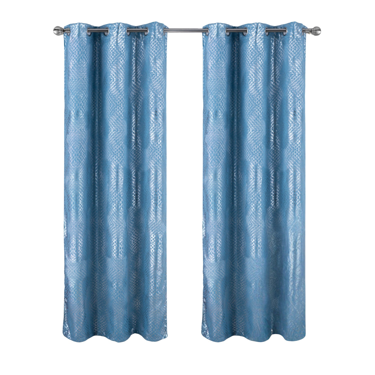 Elevate your home décor with the Hailey Halo Foil 2 Pack Blackout Grommet Curtains Wedge, designed to blend modern style with everyday functionality. Each panel features a shimmering geometric foil pattern that adds a subtle touch of glamour to any room, while the blackout fabric helps create a calm and private atmosphere. Perfect for living rooms, bedrooms, or offices, these curtains effectively block light, reduce glare, and enhance comfort throughout the day. The grommet top design ensures smooth sliding and effortless installation on standard curtain rods, giving you both convenience and elegance. Each set includes two panels, each measuring 36" x 84", offering complete coverage for windows up to 72 inches wide with available color Black, Red, Taupe, Wedge, and White. Crafted from 100% polyester, they are durable, machine washable, and easy to maintain, making them a long-lasting choice for your space. Available in a range of versatile colors to suit any interior style.DURABLE MATERIAL: Crafted from 100% polyester, these blackout curtains offer excellent strength and resistance to wear. The fabric maintains its shape and finish after repeated use, ensuring long-lasting performance and dependable quality. ELEGANT LIGHT FILTER: Designed with a shimmering geometric foil pattern, these curtains not only block unwanted sunlight but also add a subtle shine, bringing depth, sophistication, and modern flair to your décor while enhancing room ambiance. SIMPLE INSTALLATION: Featuring a grommet top design, the panels easily slide onto most standard curtain rods. This ensures hassle-free hanging, smooth movement, and a polished look that instantly upgrades your windows with minimal effort. VERSATILE DESIGN: Ideal for bedrooms, living rooms, or offices, these curtains provide blackout benefits while complementing various décor styles. Their timeless design and available color options make them suitable for both casual and formal spaces. EASY MAINTENANCE: Machine washable for everyday convenience, these curtains are simple to care for and retain their beauty over time. The durable polyester fabric resists fading and wrinkling, making upkeep stress-free and efficient.