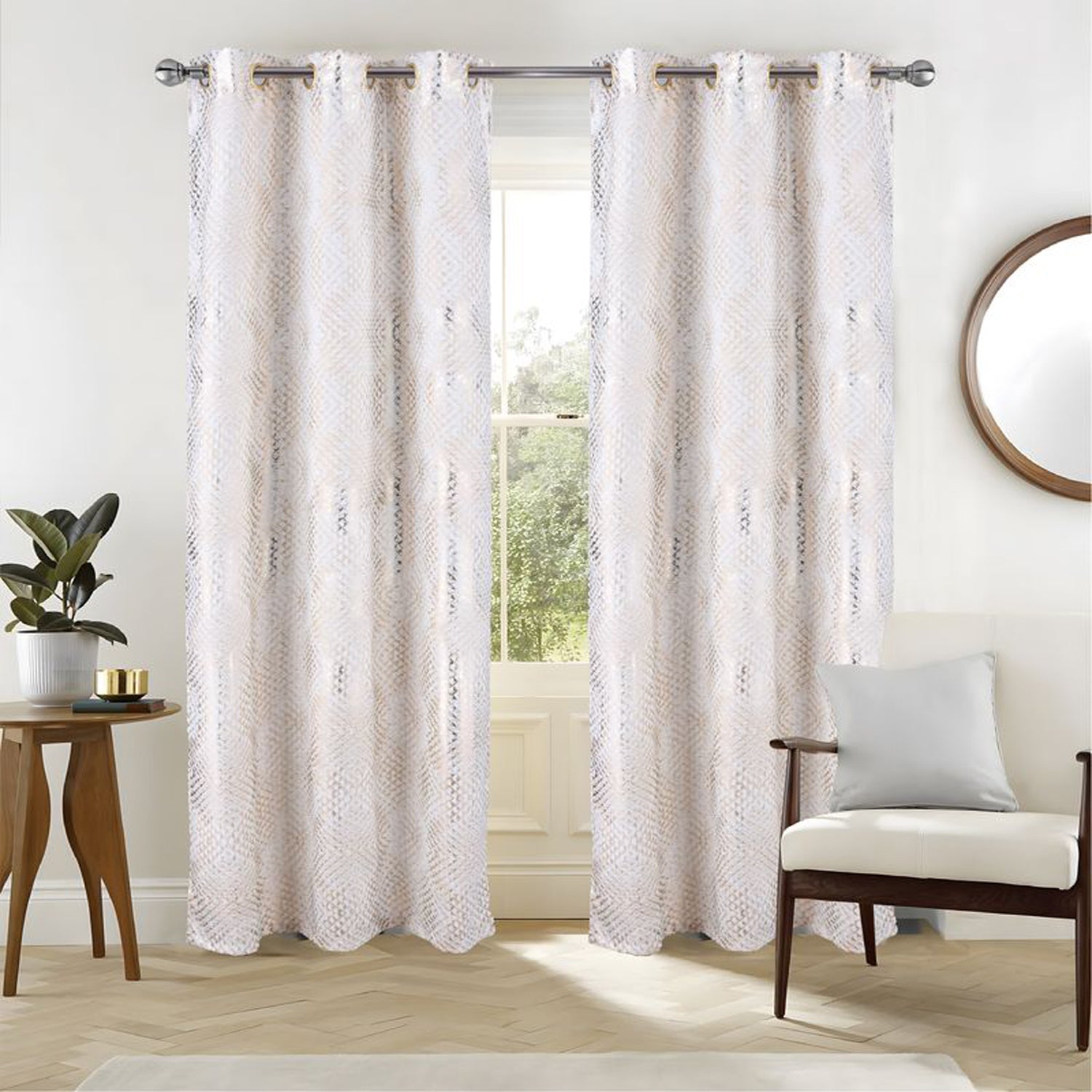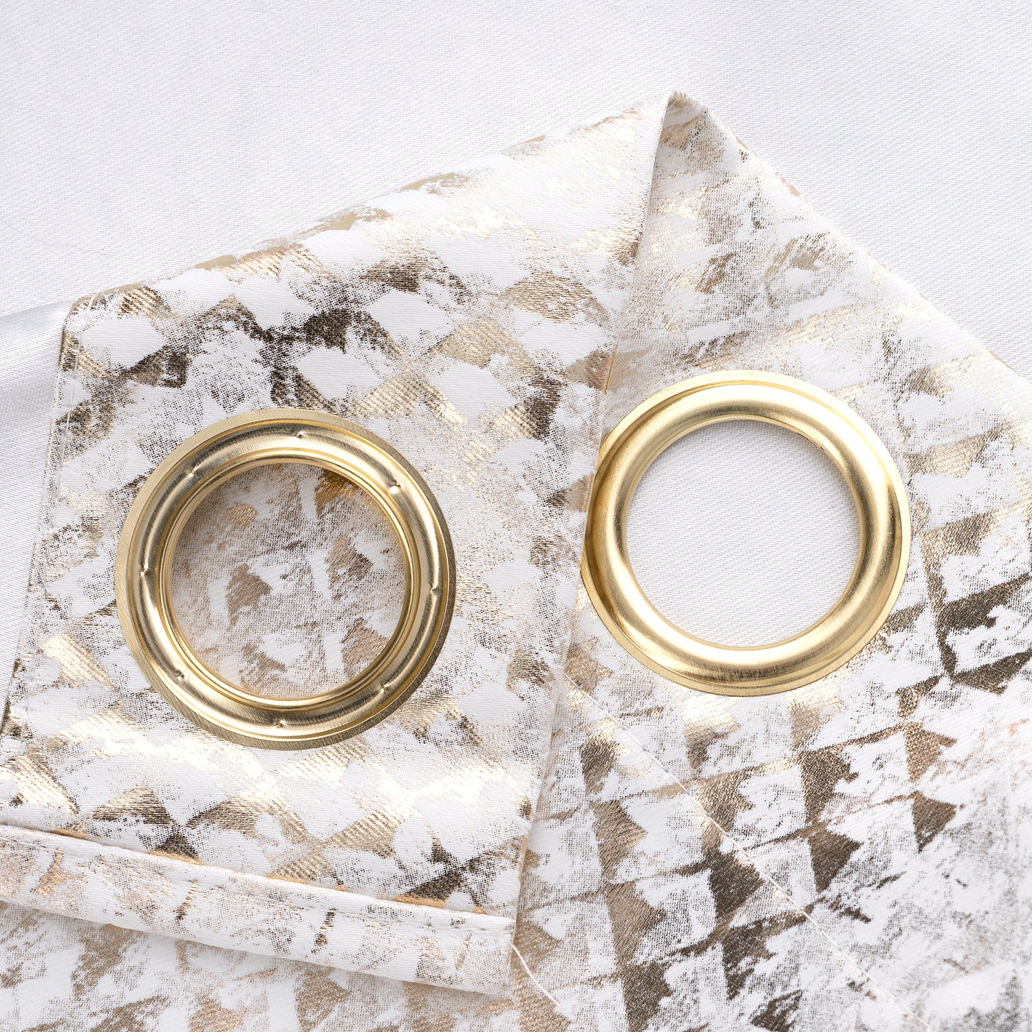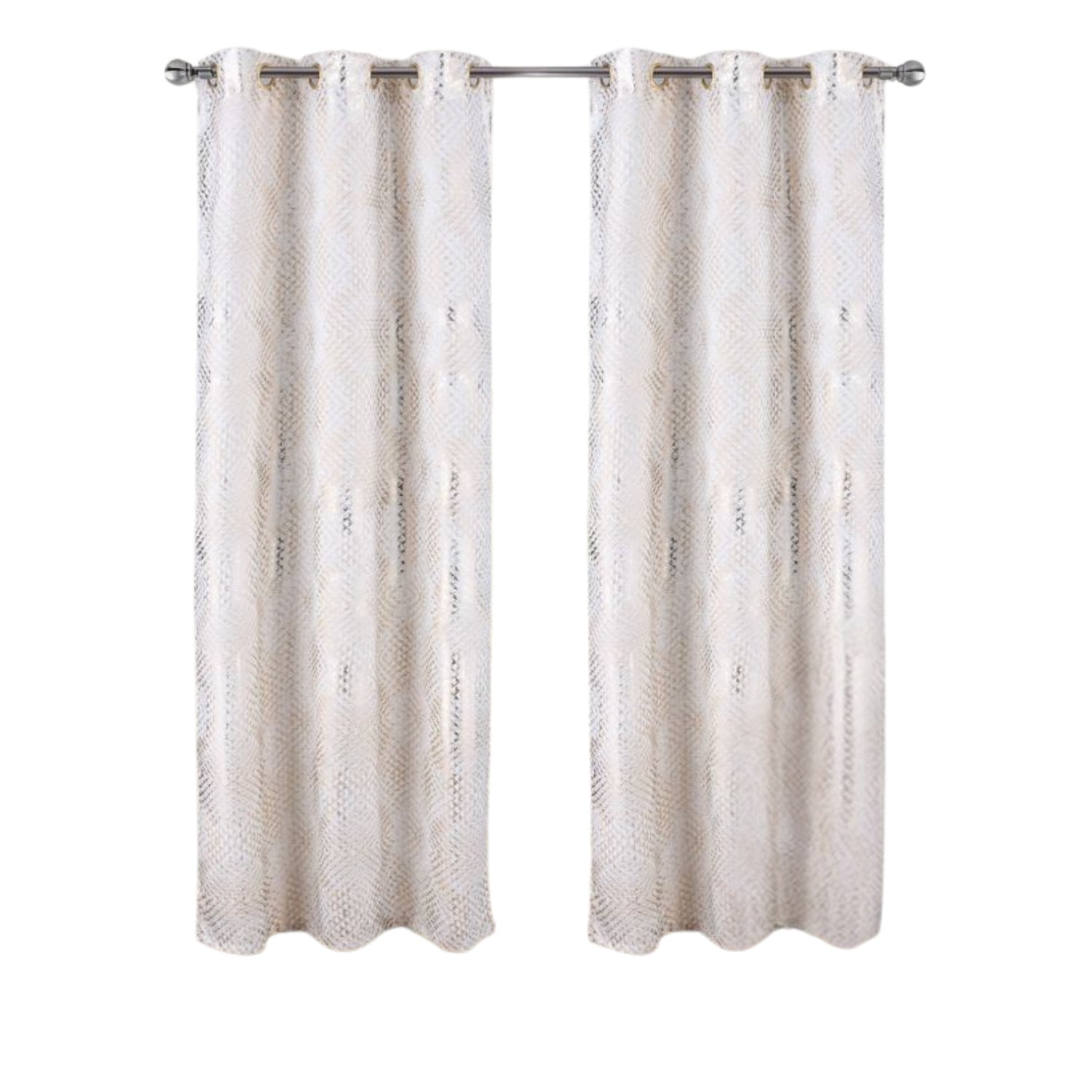 Elevate your home décor with the Hailey Halo Foil 2 Pack Blackout Grommet Curtains White, designed to blend modern style with everyday functionality. Each panel features a shimmering geometric foil pattern that adds a subtle touch of glamour to any room, while the blackout fabric helps create a calm and private atmosphere. Perfect for living rooms, bedrooms, or offices, these curtains effectively block light, reduce glare, and enhance comfort throughout the day. The grommet top design ensures smooth sliding and effortless installation on standard curtain rods, giving you both convenience and elegance. Each set includes two panels, each measuring 36" x 84", offering complete coverage for windows up to 72 inches wide with available color Black, Red, Taupe, Wedge, and White. Crafted from 100% polyester, they are durable, machine washable, and easy to maintain, making them a long-lasting choice for your space. Available in a range of versatile colors to suit any interior style.DURABLE MATERIAL: Crafted from 100% polyester, these blackout curtains offer excellent strength and resistance to wear. The fabric maintains its shape and finish after repeated use, ensuring long-lasting performance and dependable quality. ELEGANT LIGHT FILTER: Designed with a shimmering geometric foil pattern, these curtains not only block unwanted sunlight but also add a subtle shine, bringing depth, sophistication, and modern flair to your décor while enhancing room ambiance. SIMPLE INSTALLATION: Featuring a grommet top design, the panels easily slide onto most standard curtain rods. This ensures hassle-free hanging, smooth movement, and a polished look that instantly upgrades your windows with minimal effort. VERSATILE DESIGN: Ideal for bedrooms, living rooms, or offices, these curtains provide blackout benefits while complementing various décor styles. Their timeless design and available color options make them suitable for both casual and formal spaces. EASY MAINTENANCE: Machine washable for everyday convenience, these curtains are simple to care for and retain their beauty over time. The durable polyester fabric resists fading and wrinkling, making upkeep stress-free and efficient.