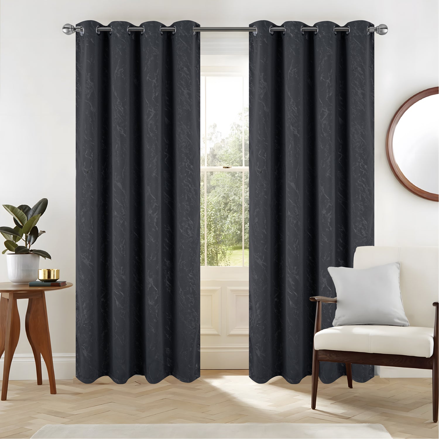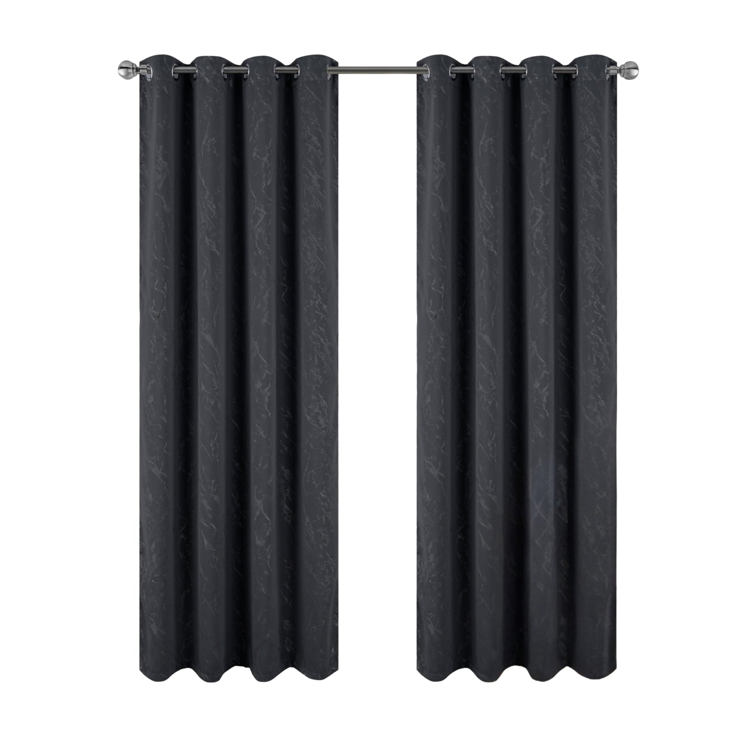 Bring refined glamour to your home with the Heidi Halo Foil Blackout Grommet Panel, designed with a chic marble-inspired foil pattern that introduces a touch of luxury to any space. Perfect for contemporary interiors, this curtain blends stylish design with practical functionality, offering blackout benefits that block unwanted light and improve privacy. Measuring 52" x 84", the panel fits most windows with ease, while the grommet top ensures smooth sliding and hassle-free installation. The metallic marble effect adds dimension and modern flair without overwhelming your décor, making it versatile for bedrooms, living rooms, or offices. Crafted from 100% polyester, it is wrinkle-resistant, durable, and machine washable, making it both beautiful and easy to maintain. Available in Black, the Heidi Halo Foil Curtain pairs effortlessly with modern and transitional home styles, delivering understated elegance with a luminous finish.