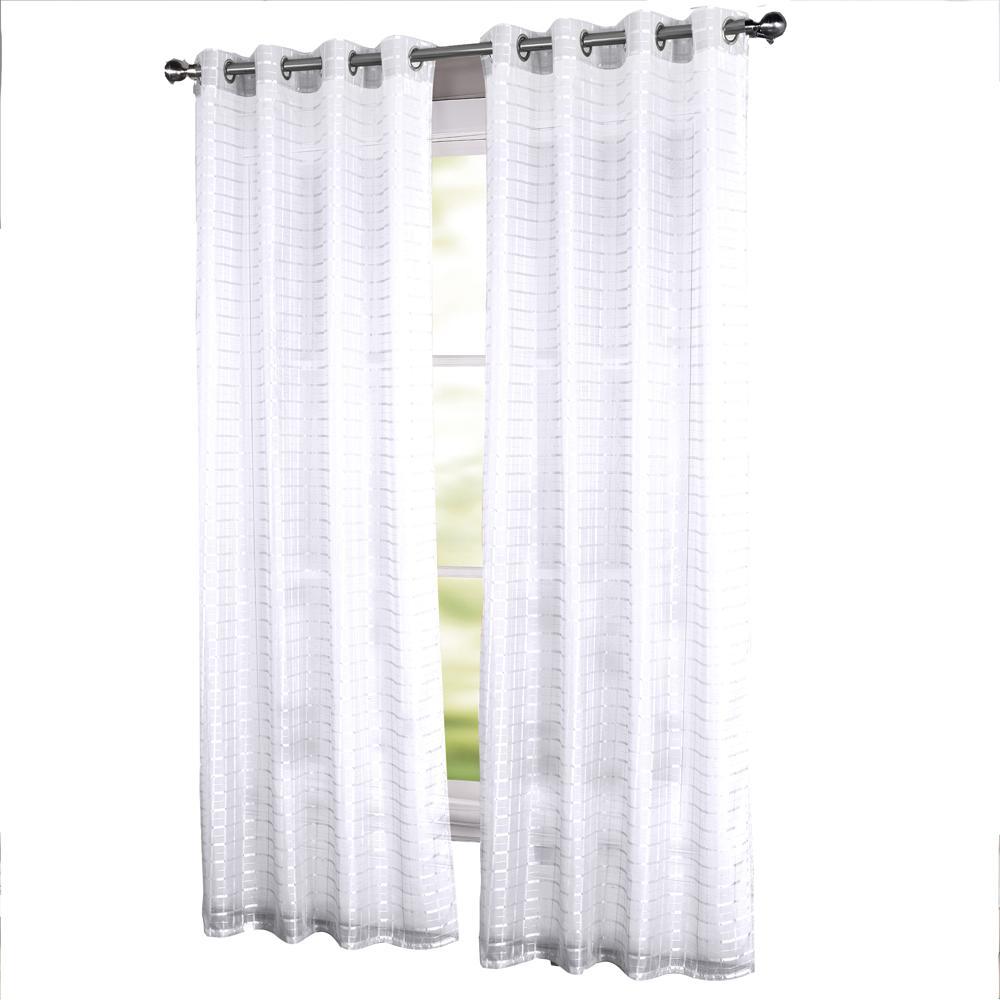 The RT Designers Collection wanda box voile grommet panel is a beautiful addition to your home decor with a subtle geometric pattern. It features 8 shiny silver metal grommets for easy hanging. The panel is machine washable and provides a light-filtering and refreshing new look. This geometric pattern design grommet panel is a versatile curtain panel that can be used in bedrooms, living rooms, and dining rooms. This curtain is made with 100% polyester. It can help to block out light, provide privacy, and add a touch of style to your home décor. Measures: 54" x 90". Color: White.