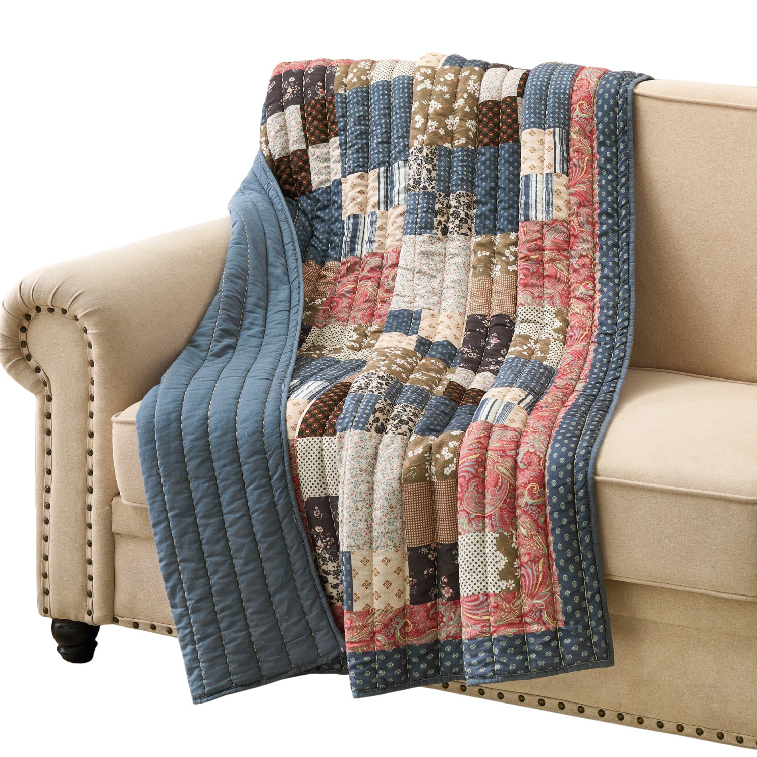 Add a touch of handcrafted charm to your home with the Greenland Home Fashions Shiloh Calico Throw. Designed with an intricate patchwork print that mimics traditional stitching, Shiloh combines floral, paisley, and geometric patterns in harmonious shades of blue, pink, and cream. The printed border frames the quilt beautifully, while decorative stitching adds cozy texture. The reverse side features a solid calming blue, offering versatile styling for any setting. Crafted with a brushed microfiber face, breathable cotton back, and plush polyester fill, this lightweight throw delivers year-round comfort. Measuring 50x60 inches, it’s perfect for reading, relaxing, or gifting.WHAT'S INCLUDED: Includes one reversible throw (50 W x 60 L inches + /- 2 inches), ideal for layering on a sofa, bed, or armchair for extra warmth and decorative flair. DIMENSIONS: Measures 50 W x 60 L inches (+/- 2 inches), the perfect lightweight size for lounging or travel, easily folding for convenient storage. PREWASHED FINISH: Prewashed and pre-shrunk to enhance softness, color depth, and flexibility, giving the throw a luxurious feel right out of the package. SAFETY TESTED: Certified by OEKO-TEX® Standard 100 to be free of over 350 harmful chemicals, providing a safer and more comfortable environment for your family. EASY CARE: Machine washable and designed to maintain its texture, color, and softness after multiple washes—made from brushed microfiber face, cotton back, and polyester fill.