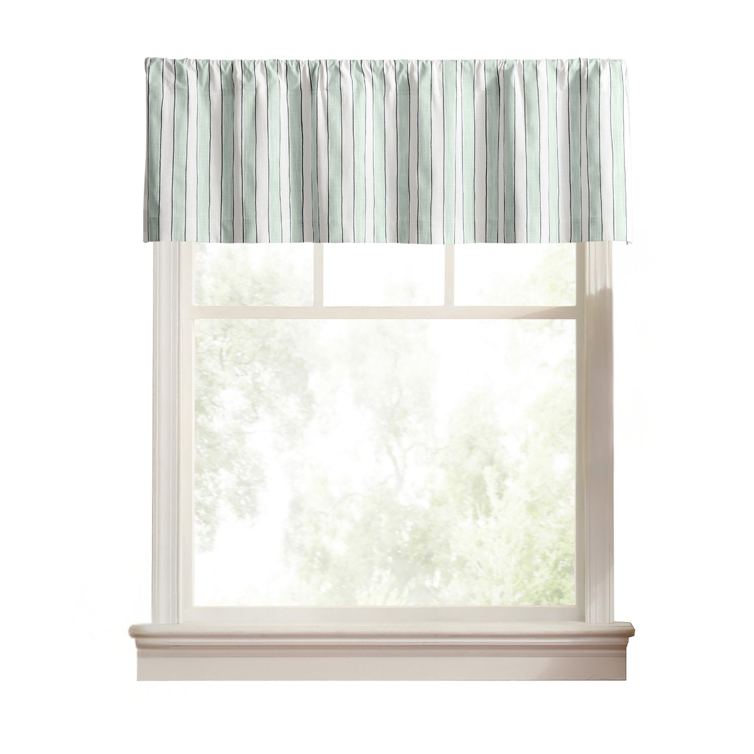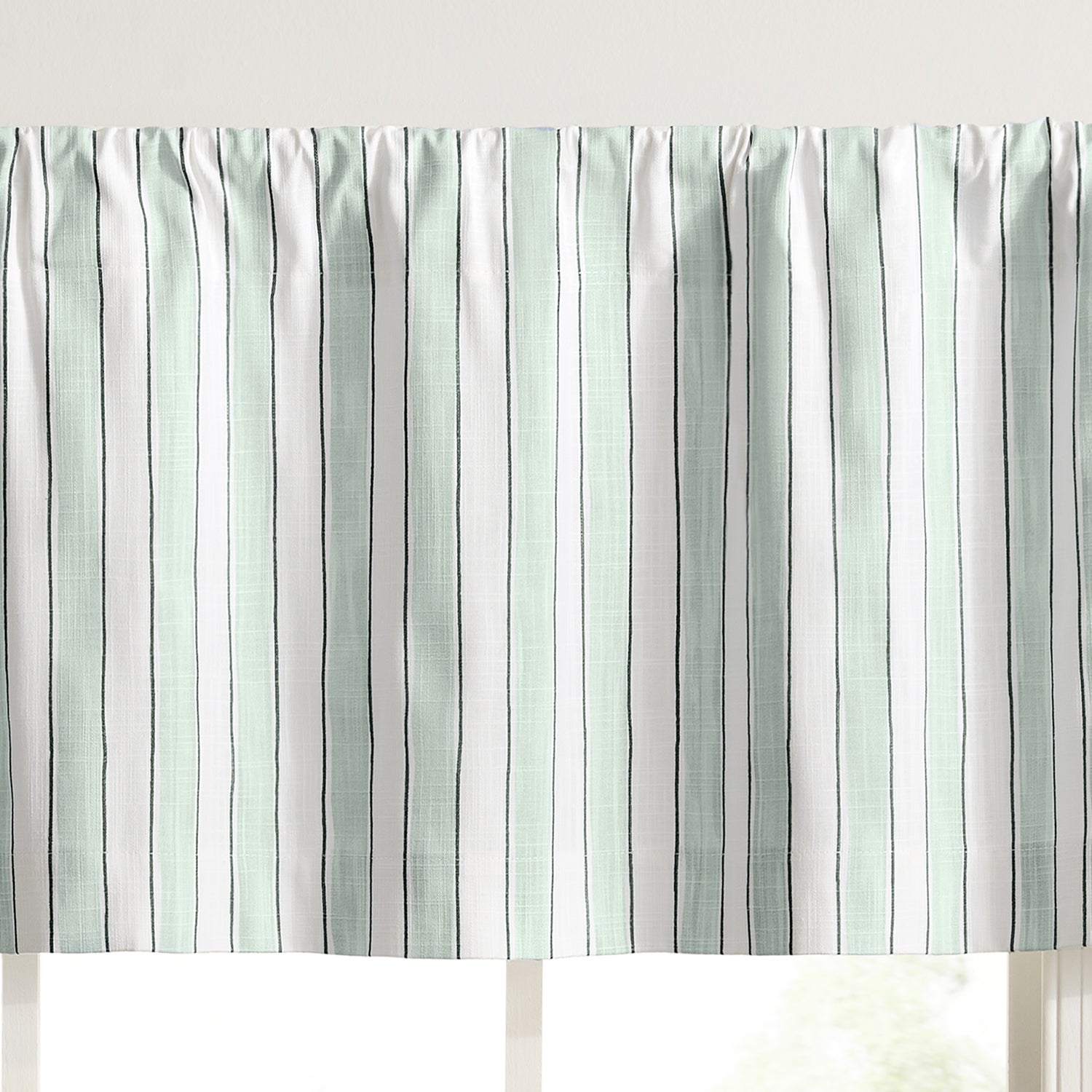 Add Classic Stripes And Timeless Charm To Your Windows. The Ellis Curtain Saratoga Stripe tailored rod pocket valance is crafted from 100% cotton, offering a naturally soft texture with long-lasting durability. Designed in a versatile 50" wide by 16" long size in Green color, this valance creates a polished look that enhances kitchens, living rooms, or dining spaces. Available in blue and green, the striped design adds depth, color, and style while complementing a wide range of décor themes. The tailored construction with a 3-inch rod pocket ensures a secure fit on most standard curtain rods, making installation quick and effortless. Proudly made in the USA, this valance delivers both quality craftsmanship and classic design. Perfect as a standalone accent or layered with coordinating tiers, it provides a crisp finish to your windows. Easy to maintain, this cotton valance is machine washable and built for everyday use, blending style with practical convenience.DURABLE MATERIAL: Made from 100% cotton, this valance provides natural softness with excellent durability. The breathable fabric ensures long-lasting use while maintaining a smooth texture that withstands daily wear and regular washing. ELEGANT LIGHT FILTER: Tailored design allows natural light to brighten your room while reducing glare for a softer ambiance. The striped pattern creates a balanced look that adds both elegance and functionality to your windows. SIMPLE INSTALLATION: Designed with a 3-inch rod pocket, this valance fits securely on most standard curtain rods. Installation is quick and hassle-free, ensuring a polished appearance without the need for complicated setup. VERSATILE DESIGN: Measuring 50" wide by 16" long, this valance suits kitchens, living rooms, and dining spaces. Offered in both blue and green, the striped finish blends easily with modern, farmhouse, or traditional décor. EASY MAINTENANCE: Machine washable for stress-free care, this cotton valance retains its color, shape, and texture wash after wash. Designed for everyday living, it offers a perfect combination of practicality and timeless style.