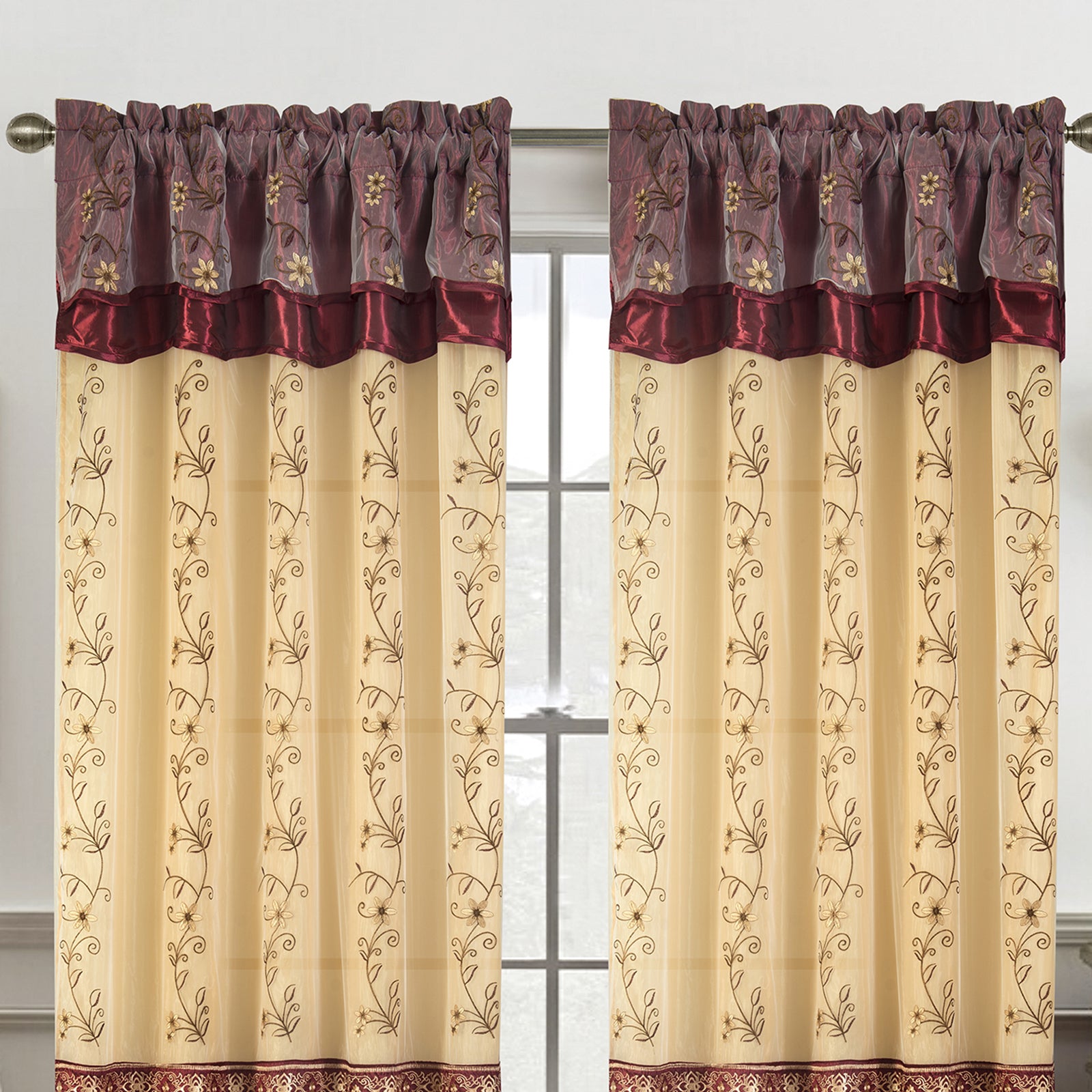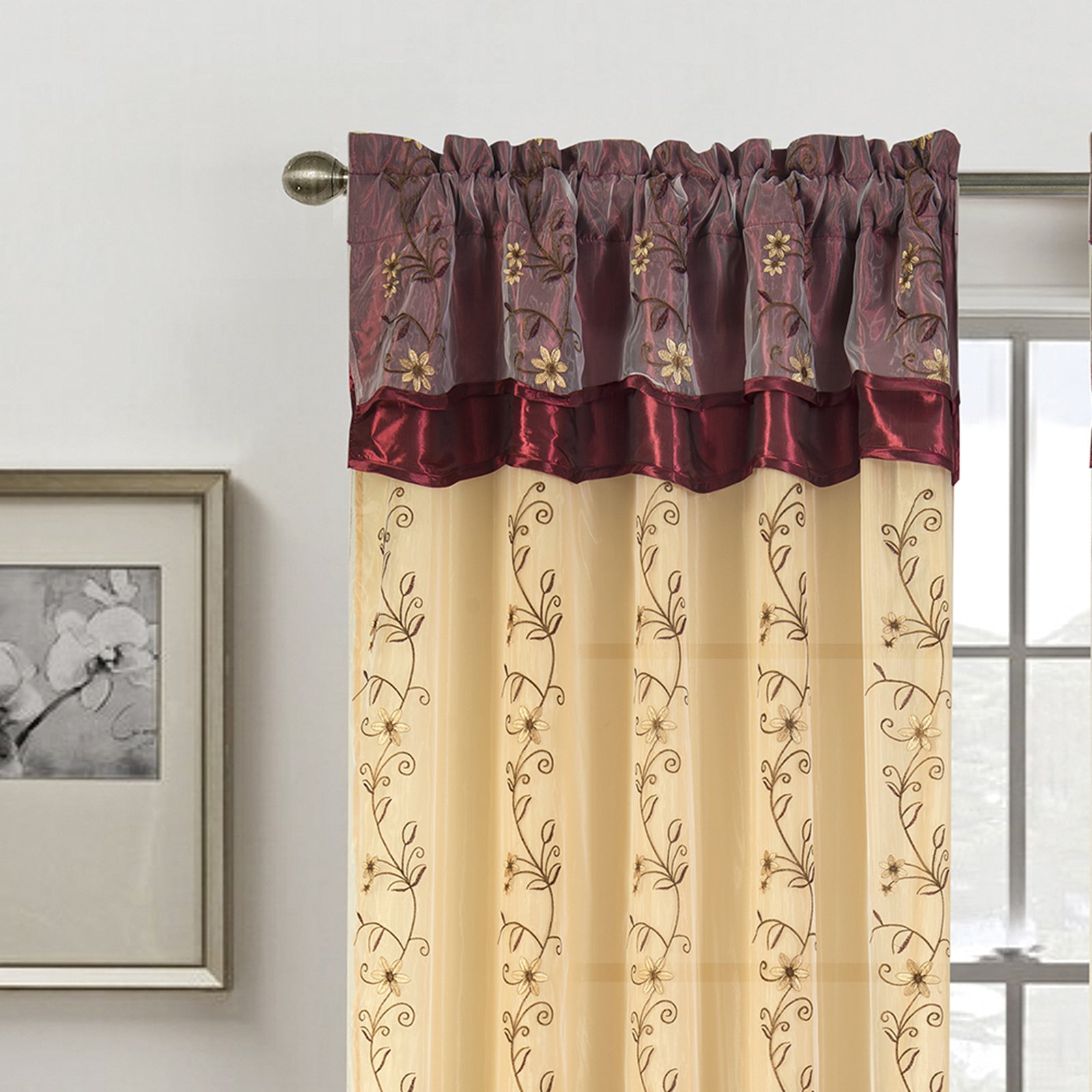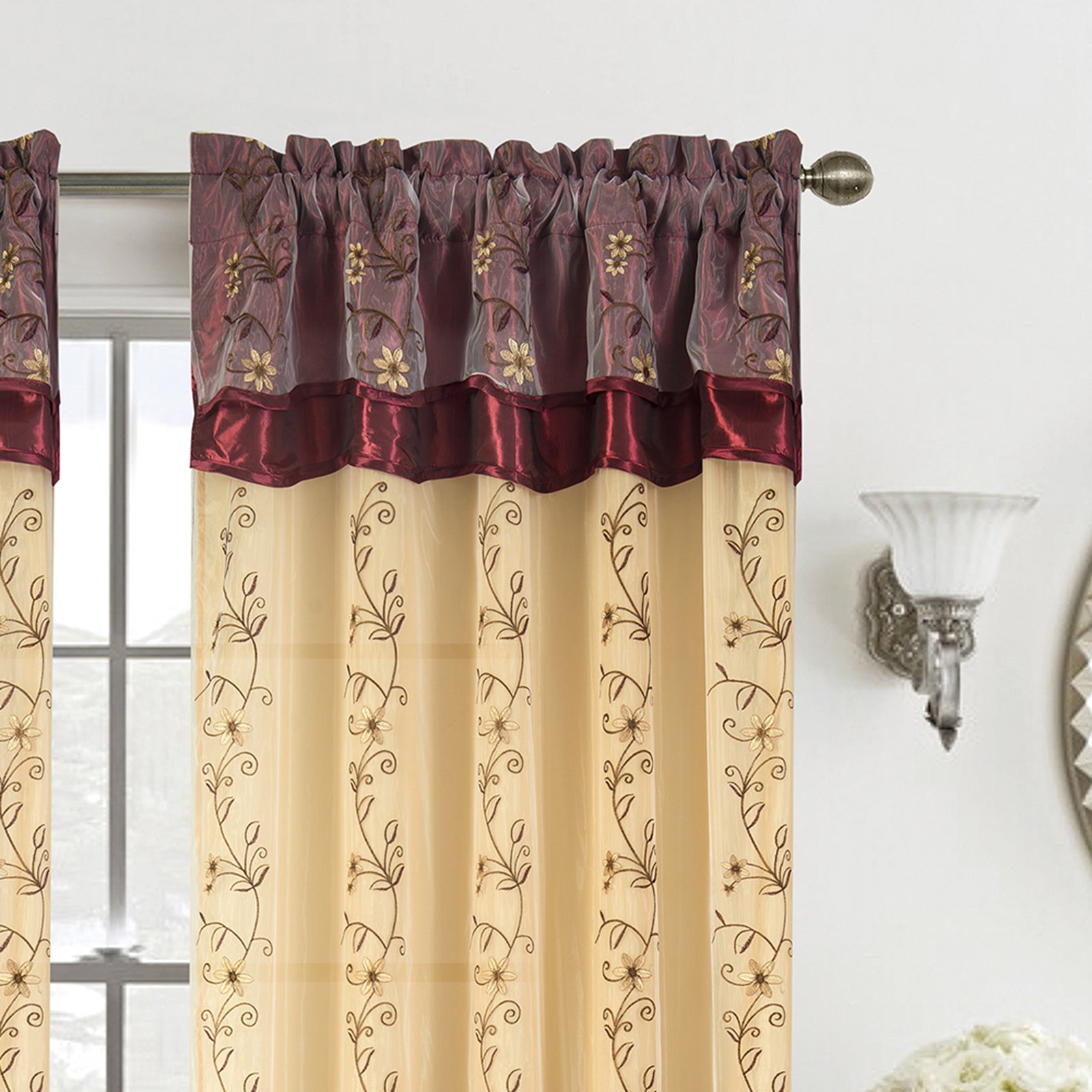 Revitalize the ambiance of any room in your home with our exquisite curtain panel. This transformative addition boasts a captivating embroidered floral design, adding a touch of timeless elegance to your window treatment. The panel is thoughtfully crafted with an attached valance, enhancing its aesthetic appeal and eliminating the need for additional embellishments. Furthermore, the curtain panel comes with a sheer backing, providing a delicate touch that allows filtered light to grace your space while maintaining privacy. This versatile window treatment seamlessly combines style and functionality, making it a perfect choice for any room in your home. Update your living space effortlessly and infuse a renewed sense of sophistication with our embroidered floral curtain panel. Elevate your window treatment to a new level of elegance and charm.Includes one (1) 54" wide x 90" long rod pocket curtain panel 18 Inch attached valance This curtain panels are made of polyester fabric These beautiful curtains are available for multiple options: Vary in colors, Burgundy, Gold, Purple, Silver, White, Yellow. Care: EASY CARE: Machine washable and quick-drying for your convenience