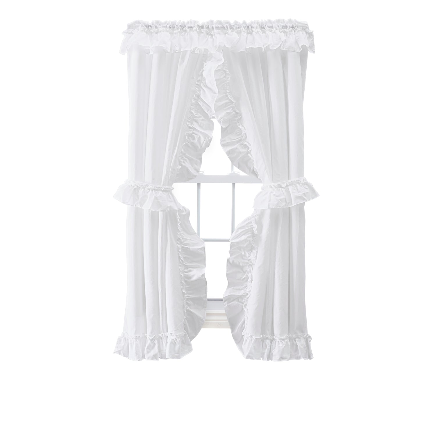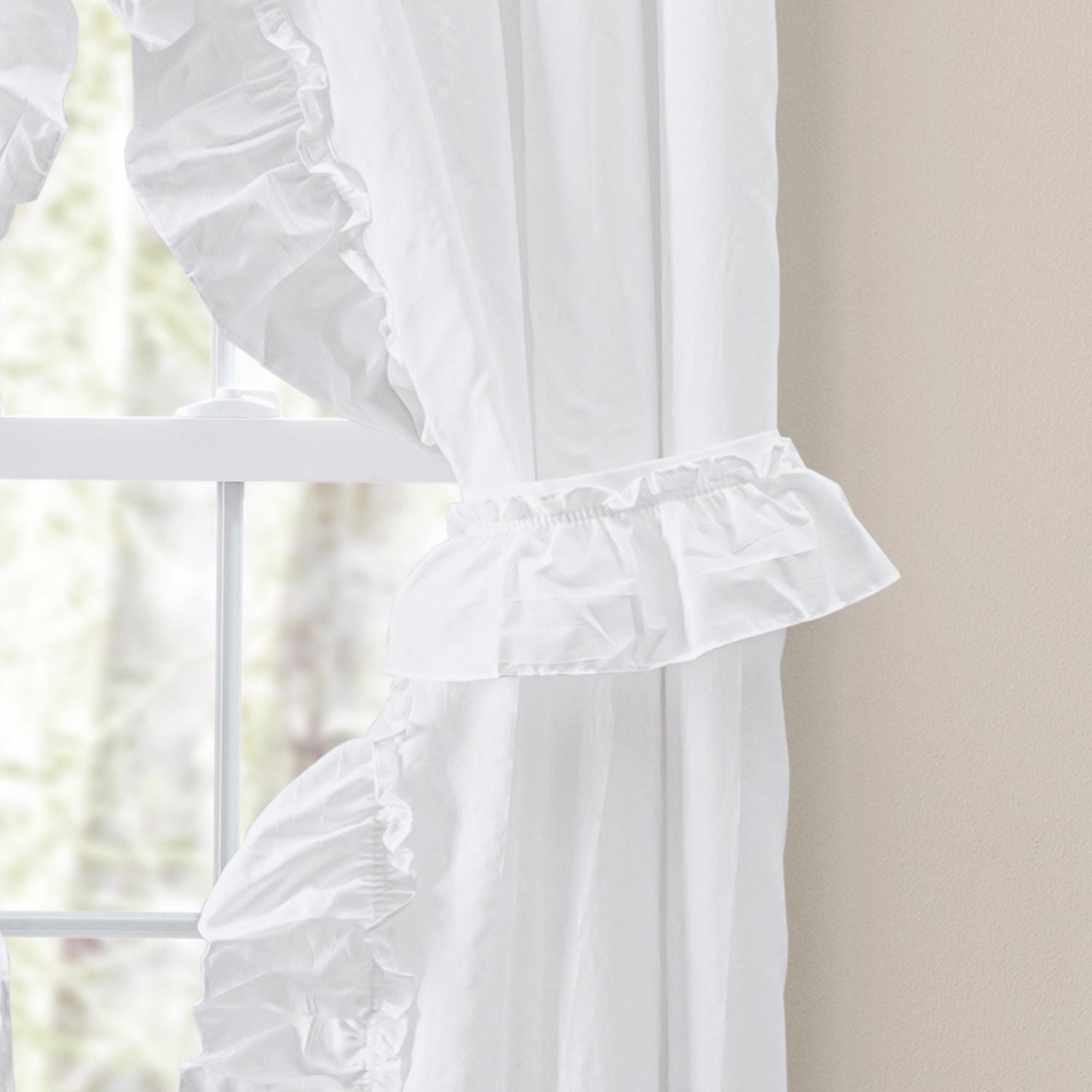 Add soft elegance and classic character to your space with the Ellis Curtain Stacey ruffled Priscilla curtain pair. Designed in a soothing White color, this style brings a calm, welcoming feel that works beautifully in bedrooms, living rooms, or traditional interiors. Available in 54x63 and 54x84 sizes, it offers flexible coverage for different window heights while creating graceful fullness. The ruffled Priscilla design delivers a romantic, gathered look, enhanced by included tiebacks for versatile styling options. Crafted from a balanced blend of 70% polyester and 30% cotton, the fabric combines durability with a comfortable, natural feel. Its solid color design blends easily with existing décor, while machine washable care ensures everyday convenience. This curtain pair is an ideal choice for those seeking timeless style with practical functionality.DURABLE MATERIAL: Made from a sturdy blend of 70% polyester and 30% cotton, this curtain pair offers lasting strength with a soft, fabric touch. The material is designed to hold its shape and texture, making it suitable for regular use. ELEGANT LIGHT FILTER: The ruffled Priscilla design gently filters natural light, creating a warm and inviting atmosphere. It helps soften brightness while maintaining a pleasant level of privacy, making rooms feel comfortable throughout the day. SIMPLE INSTALLATION: Designed for easy hanging, this curtain pair installs smoothly on compatible rods and styles effortlessly with the included tiebacks. Setup allows for natural gathers and flexible light control without complicated adjustments. VERSATILE DESIGN: Available in 54x63 and 54x84 sizes, this curtain adapts well to different window heights. The soft White color and classic ruffled styling complement traditional, cottage, or casual décor themes. EASY MAINTENANCE: This curtain pair is machine washable for stress-free care. The easy-care fabric blend helps retain its color, structure, and ruffled appearance after washing, making routine cleaning simple and convenient.