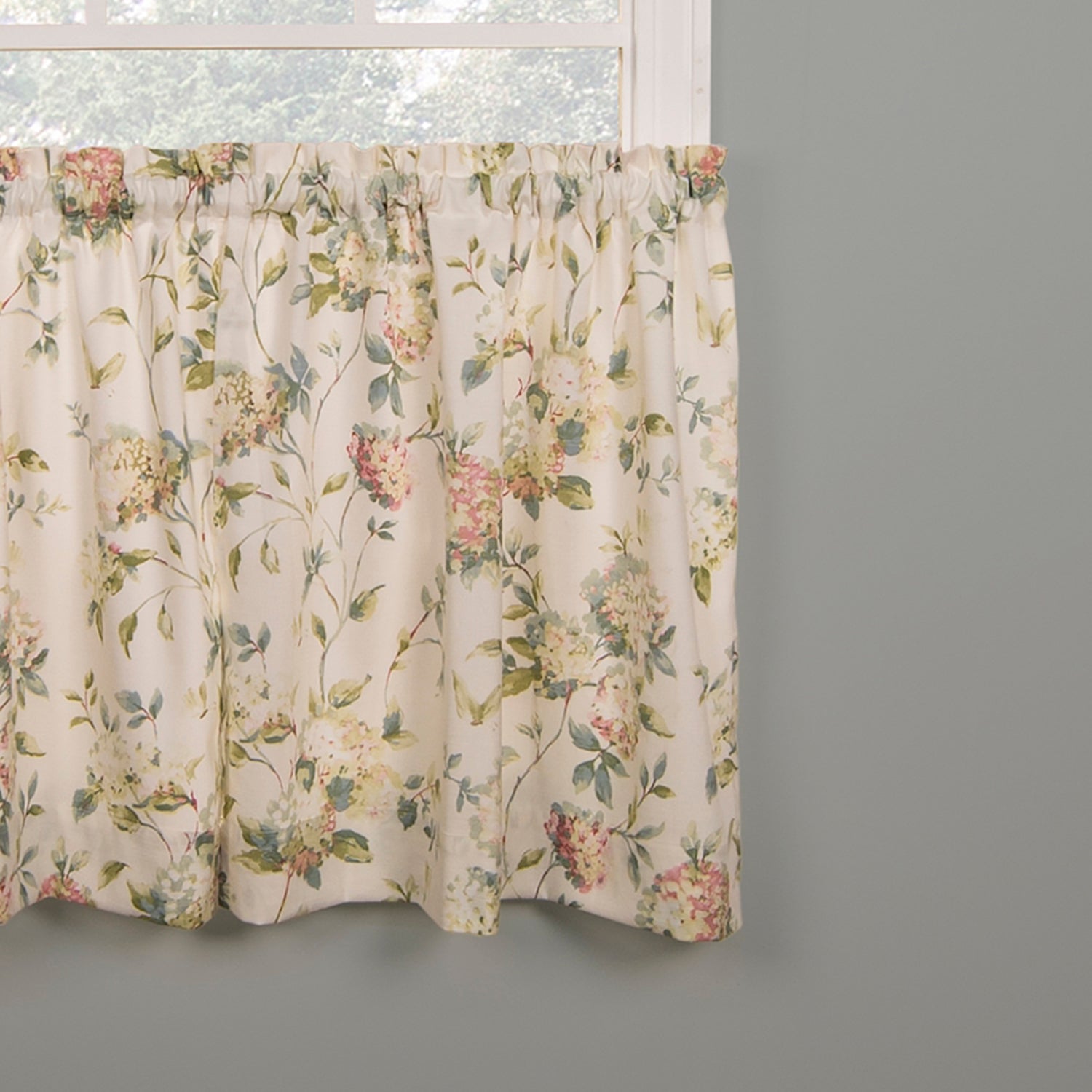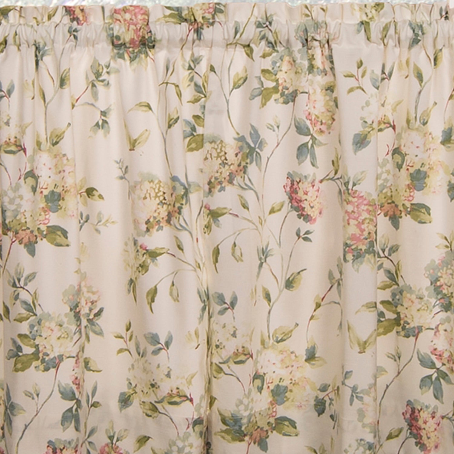 Abigail Hydrangea Tailored Tier Curtains - Bring the gorgeous sights of Spring indoors. Our traditional hydrangea pattern on high quality fabric will drape beautifully and bring a breath of fresh air into the entire room. Abigail is a multi colored traditional Hydrangea floral print pattern on solid natural colored ground that features a range of shades and colors that coordinate easily with a variety of solids and patterns within your home. Made with 52-percent polyester/48-percent 5-ounce cotton fabric creates a smooth draping effect, soft texture and easy maintenance.Tailored Tier curtains are used to cover the lower portion of your windows or used alone on shorter length windows. For wider windows simply add multiple panels together. Abigail Tailored Tier Curtains can be combined with a choice of 3 matching Abigail Valances, Panels with Tiebacks and Shower Curtain. Machine washable. Available size - 56x24" and 56x36". Color: Multi.Abigail Design Printed Room Window Rod Pocket Pair Set With 2 Tiers - 56x24" and 56x36", Multi Made from 52% polyester and 48% cotton that creates a smooth draping effect. Solid color fabric construction for room darkening, increase privacy and sun protection. Rod pocket window curtain pair can bring a breath of fresh air into the entire room. Care instruction: Easy care - Machine Wash - Dry.