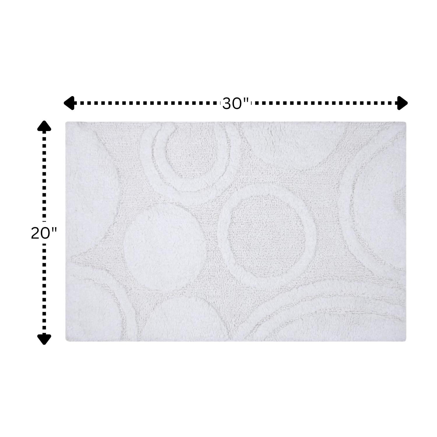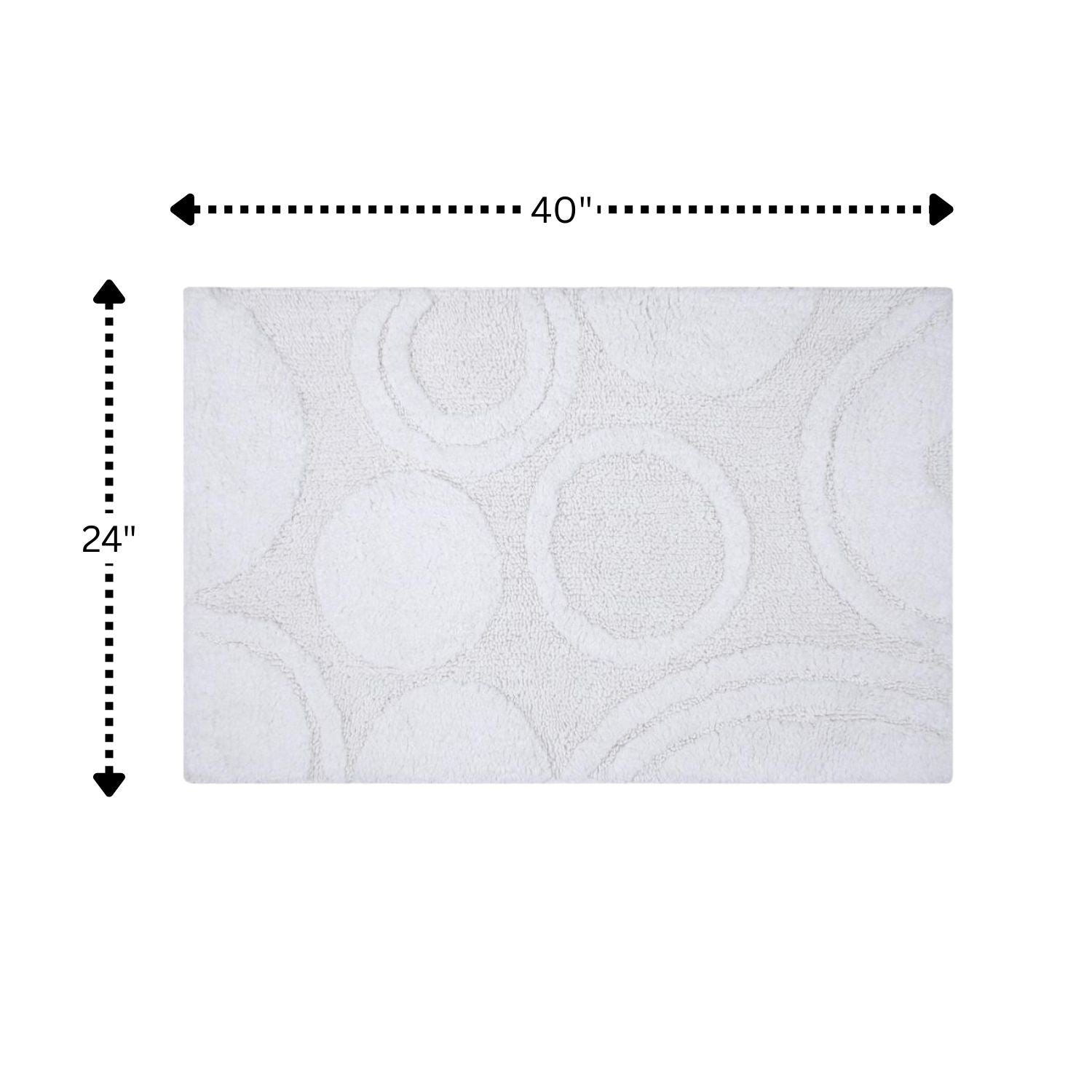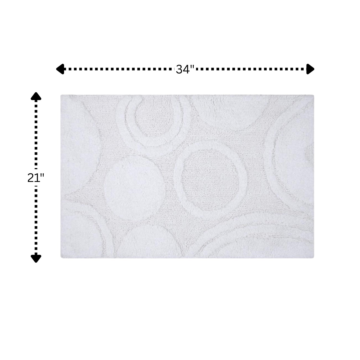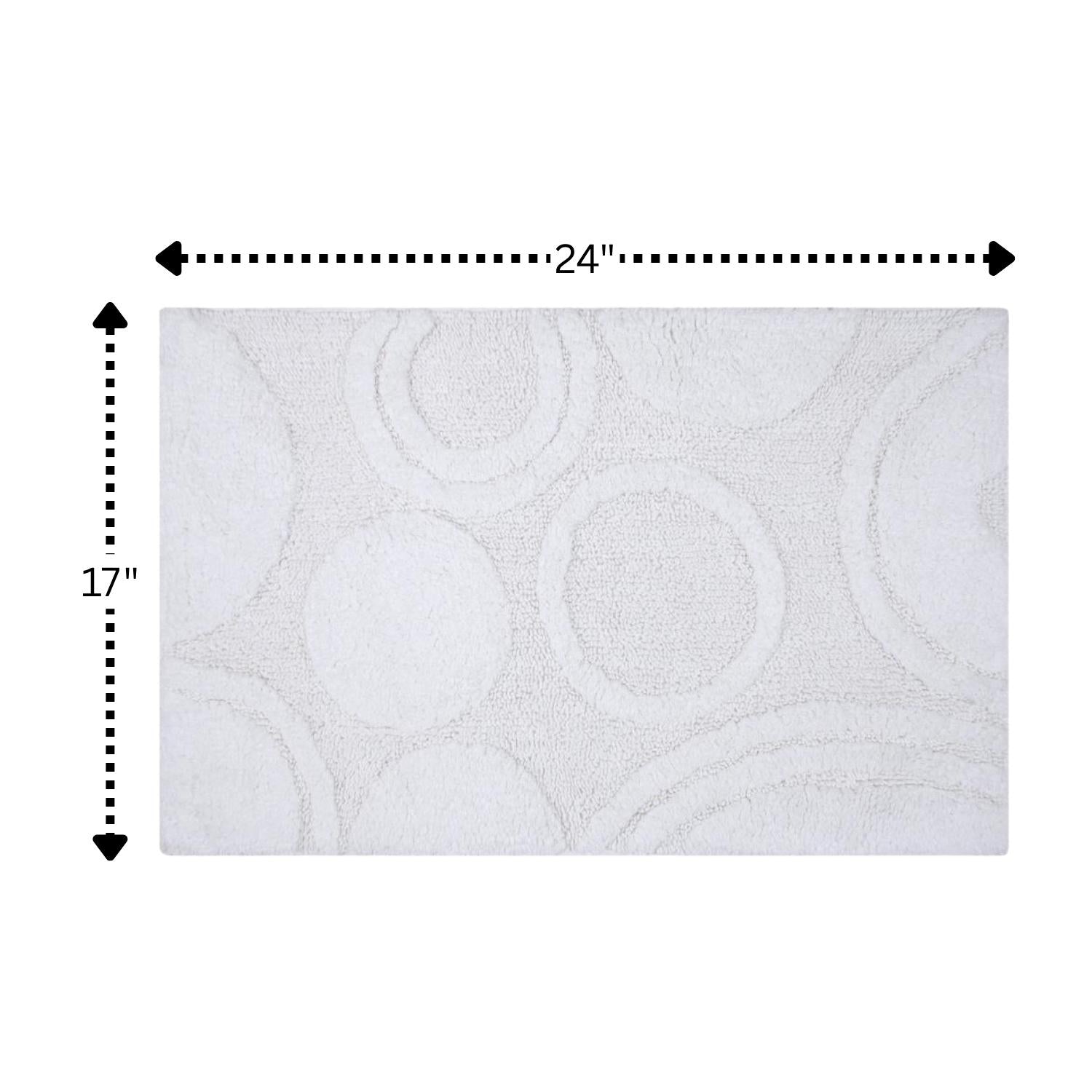 This luxurious 100% soft plush cotton bath rug features an all over circle design with a non-skid back. It's super soft to the touch with a dense lush pile. It's the ultimate in comfort while being extremely absorbent and functional. The elegant range of contempory colors will enhance any bathroom decor. Available Size: 17x24", 20x30", 21x34" and 24x40". Color: White.Orbit Bath Rug Cotton Non Skid Back - 17x24", 20x30", 21x34" and 24x40". Color: White Machine wash with like colors, tumble dry low heat. 220 GSF Non Skid Back 100% Cotton
