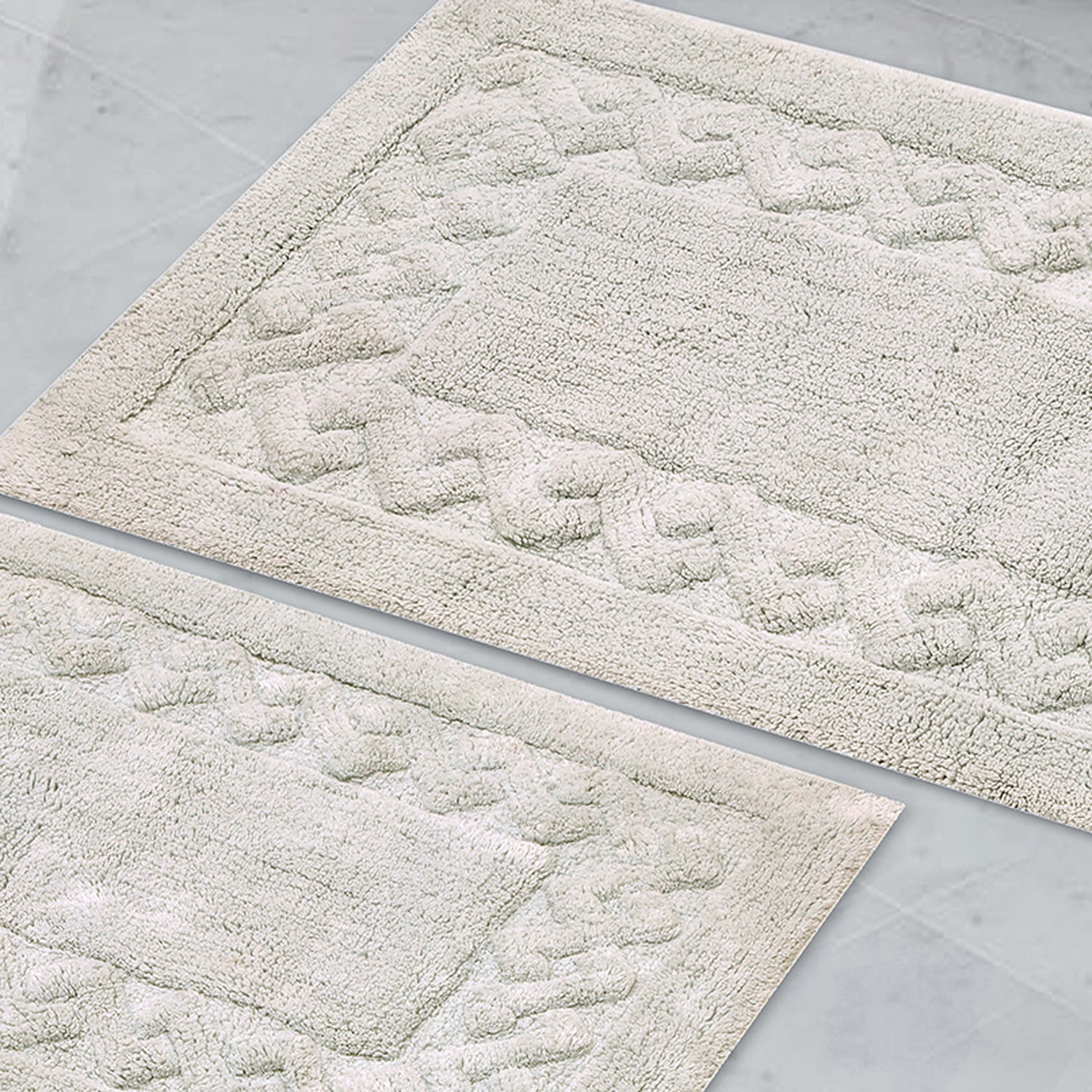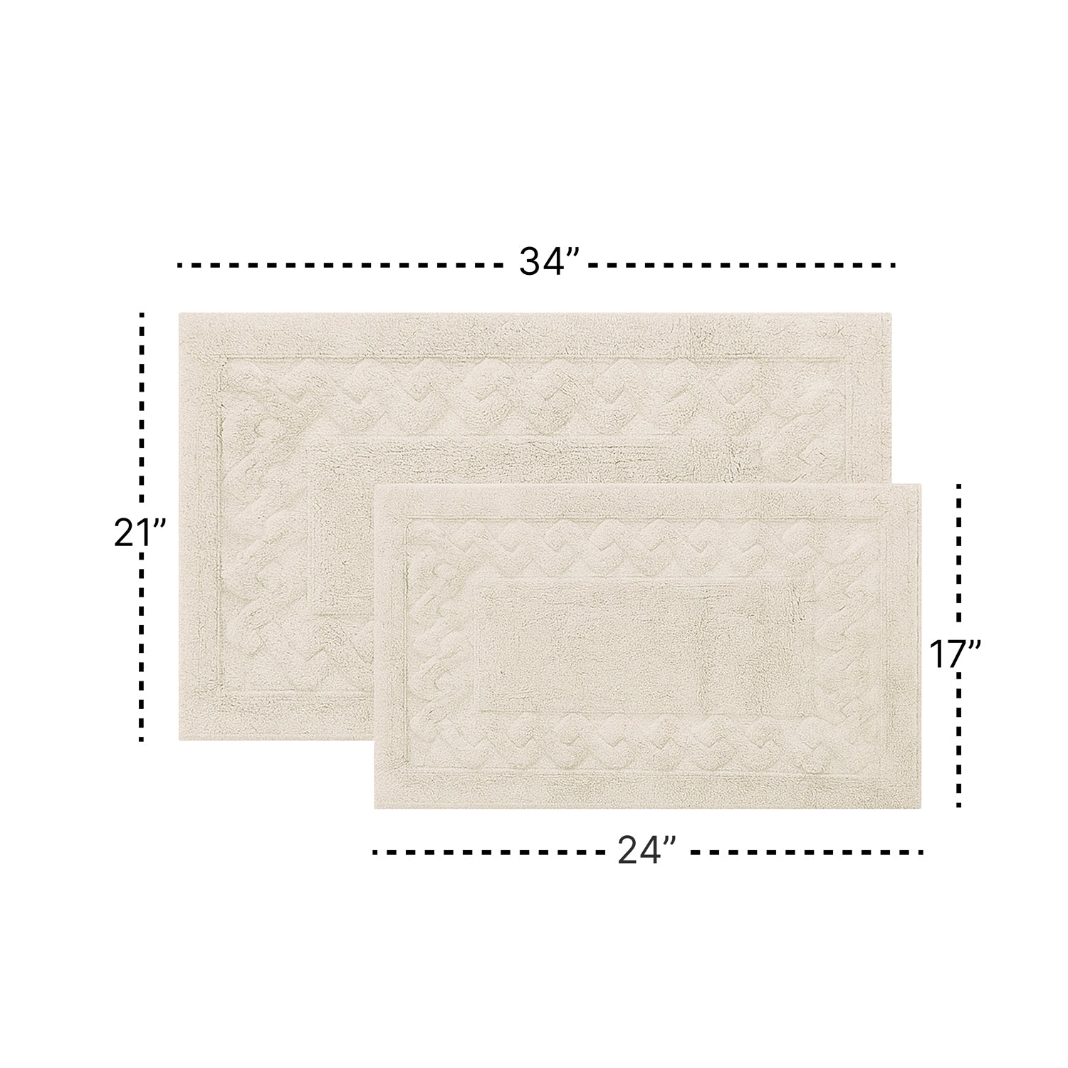 Experience a blend of elegance and comfort with the Knightsbridge Ivory Bath Rug Set, crafted from 100% soft plush cotton. Designed with a classic chain pattern, this two-piece set includes sizes 17" x 24" and 21" x 34", perfect for layering in your bathroom. Its dense pile delivers ultimate softness underfoot, while the non-skid backing keeps it securely in place. Highly absorbent and quick-drying, it ensures your space stays fresh and clean. The rich ivory hue adds timeless charm to any décor, creating a warm and refined aesthetic. Machine washable for effortless care, this rug set combines function, durability, and luxury in every thread.DURABLE MATERIAL: Crafted from 100% premium cotton with a plush pile for long-lasting softness. The dense weave enhances durability, while the non-skid latex backing ensures stability even on smooth floors for safe and comfortable daily use. INCLUDING ITEMS: This 2-piece set includes one 17" x 24" and one 21" x 34" rug, perfectly sized for your sink and shower areas. Together, they provide coordinated coverage that complements your bathroom layout beautifully and evenly. VERSATILE DESIGN: Featuring a classic chain border, this Ivory rug set enhances both modern and traditional bathrooms. Its subtle neutral tone brings a clean, elegant aesthetic while blending effortlessly with any bath color scheme. REVERSIBLE STYLE: Designed for extended wear, this rug offers plush texture on both sides. Simply flip it for an instant refresh — maintaining softness and style while doubling the rug’s lifespan through easy rotation and reuse. EASY MAINTENANCE: Machine wash separately in cold water and tumble dry low to preserve plushness. Fade- and shrink-resistant cotton fibers keep the rugs looking new and fresh even after repeated washes and daily use.