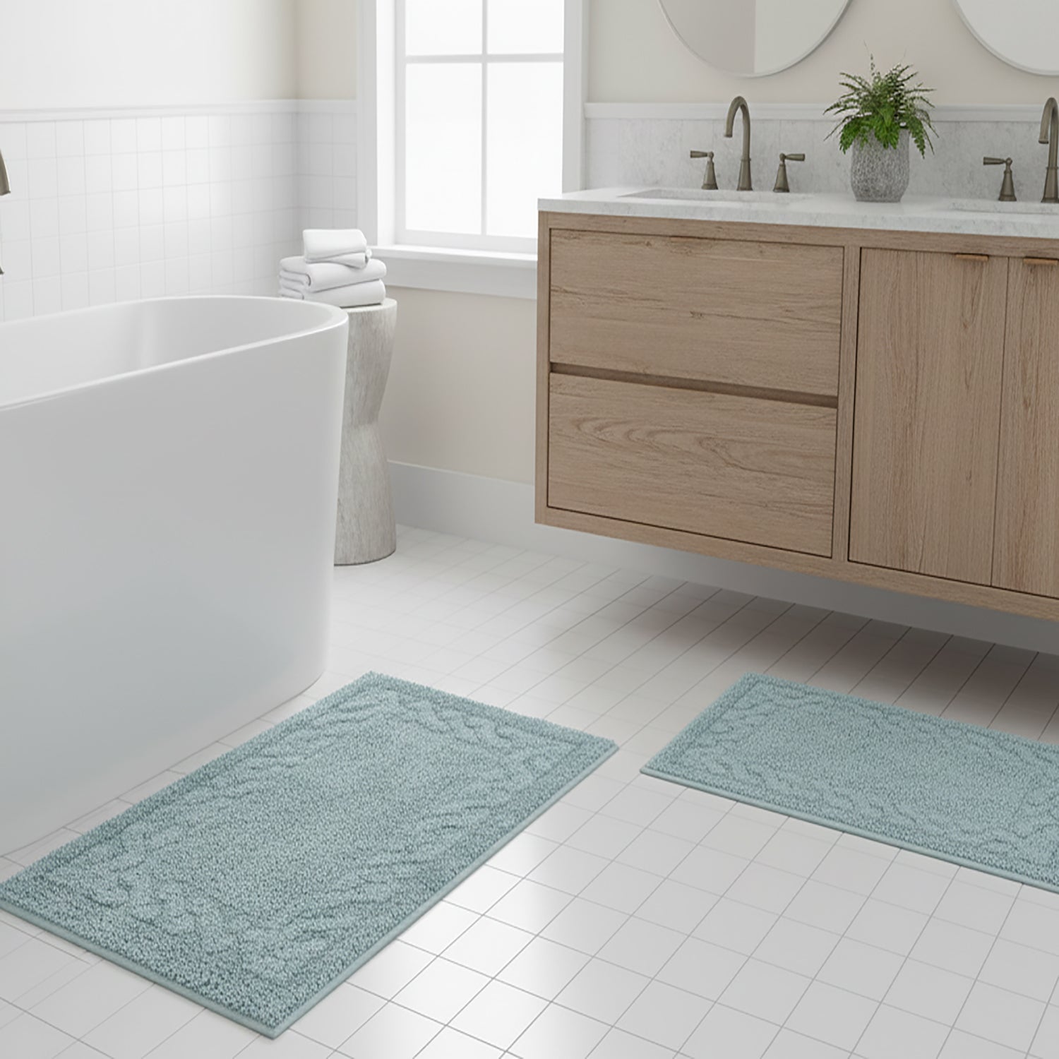 Relaxing Comfort With Knightsbridge Light Blue Chain Design: Bring a soothing touch to your bathroom with the Knightsbridge Stylish And Comfortable All Season Traditional Chain Design 2 PC Cotton Bath Rug Set in Light Blue. Includes 20" x 30" and 24" x 40" rugs crafted from soft, durable cotton. The Light Blue chain pattern creates a calming and elegant ambiance while complementing any décor style. Machine-made for durability, these rugs are reversible, plush, and easy to maintain, providing luxurious comfort and practicality for all-season use, keeping your bathroom stylish, inviting, and cozy for family and guests.DURABLE MATERIAL: Premium cotton ensures the Light Blue bath rugs 20" x 30" and 24" x 40" are soft, resilient, and long-lasting, maintaining vibrant color and plush feel even with frequent use and washing. INCLUDING ITEMS: Includes two rugs, 20" x 30" and 24" x 40" in Light Blue, perfect for placement near the shower, tub, or vanity, offering coordinated comfort and elevated style. VERSATILE DESIGN: The Light Blue chain pattern provides timeless appeal, blending seamlessly with modern and traditional bathroom styles while delivering functional comfort for everyday use. REVERSIBLE STYLE: Both sides provide the same luxurious texture and pattern, allowing reversible use for even wear and refreshing the bathroom décor without needing new rugs. EASY MAINTENANCE: Machine washable, the Light Blue rugs retain softness, color, and quality even after repeated washes, making cleaning simple and preserving their elegant look.