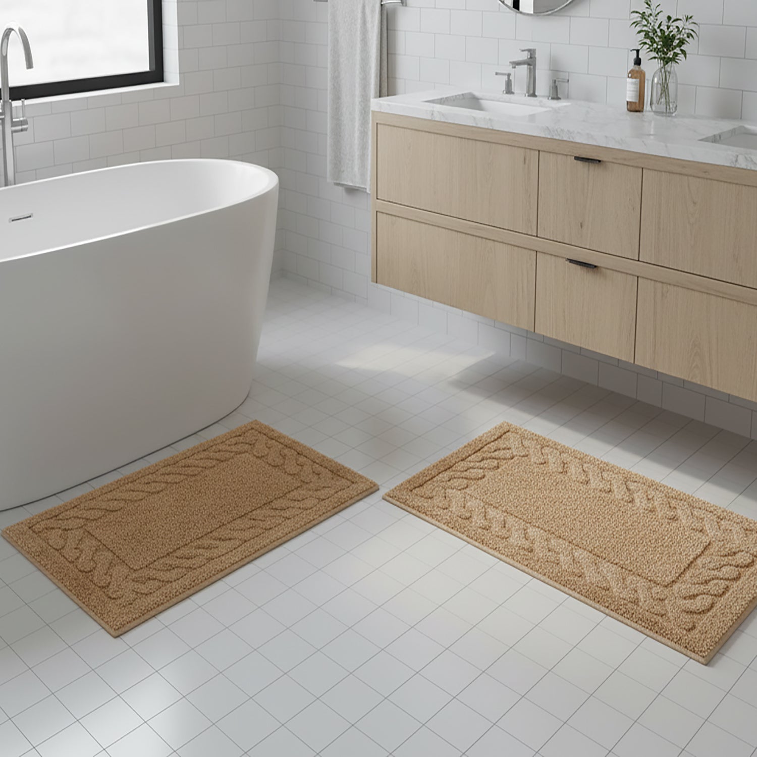Natural Comfort With Knightsbridge Chain Design: Elevate your bathroom with the Knightsbridge Stylish And Comfortable All Season Traditional Chain Design 2 PC Cotton Bath Rug Set in Natural. Includes 20" x 30" and 24" x 40" rugs made from soft cotton for luxurious all-season comfort. The warm Natural hue and classic chain design complement any décor while adding sophistication. Machine-made for quality, these rugs are reversible, plush, and easy to maintain, making them a practical and elegant addition to your bathroom, combining style, comfort, and durability for everyday use.DURABLE MATERIAL: Constructed from premium cotton, the Natural bath rugs 20" x 30" and 24" x 40" remain soft, plush, and resilient, maintaining their texture and warm natural color with daily use and frequent washing. INCLUDING ITEMS: Includes two rugs, 20" x 30" and 24" x 40" Natural, providing coordinated comfort, warmth, and elegance for your bathroom floor space while enhancing the décor. VERSATILE DESIGN: The chain pattern in Natural delivers timeless style, suitable for modern or traditional bathrooms, combining aesthetic appeal with functional cushioning. REVERSIBLE STYLE: Both sides offer the same texture and design, allowing reversible use for extended durability and keeping the rugs looking fresh and evenly worn. EASY MAINTENANCE: Machine washable, the Natural rugs maintain softness, color, and plush texture even after repeated washes, ensuring practical upkeep and lasting comfort.