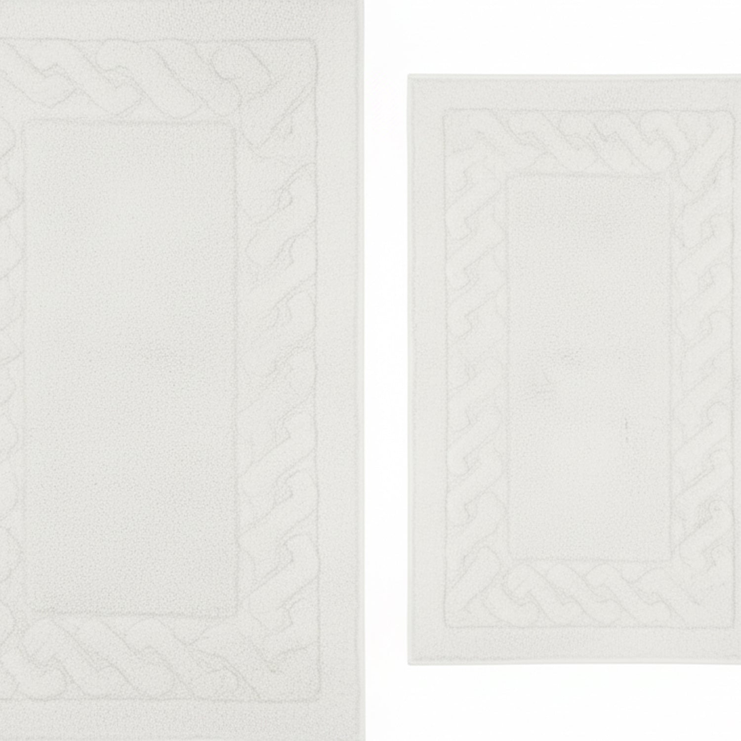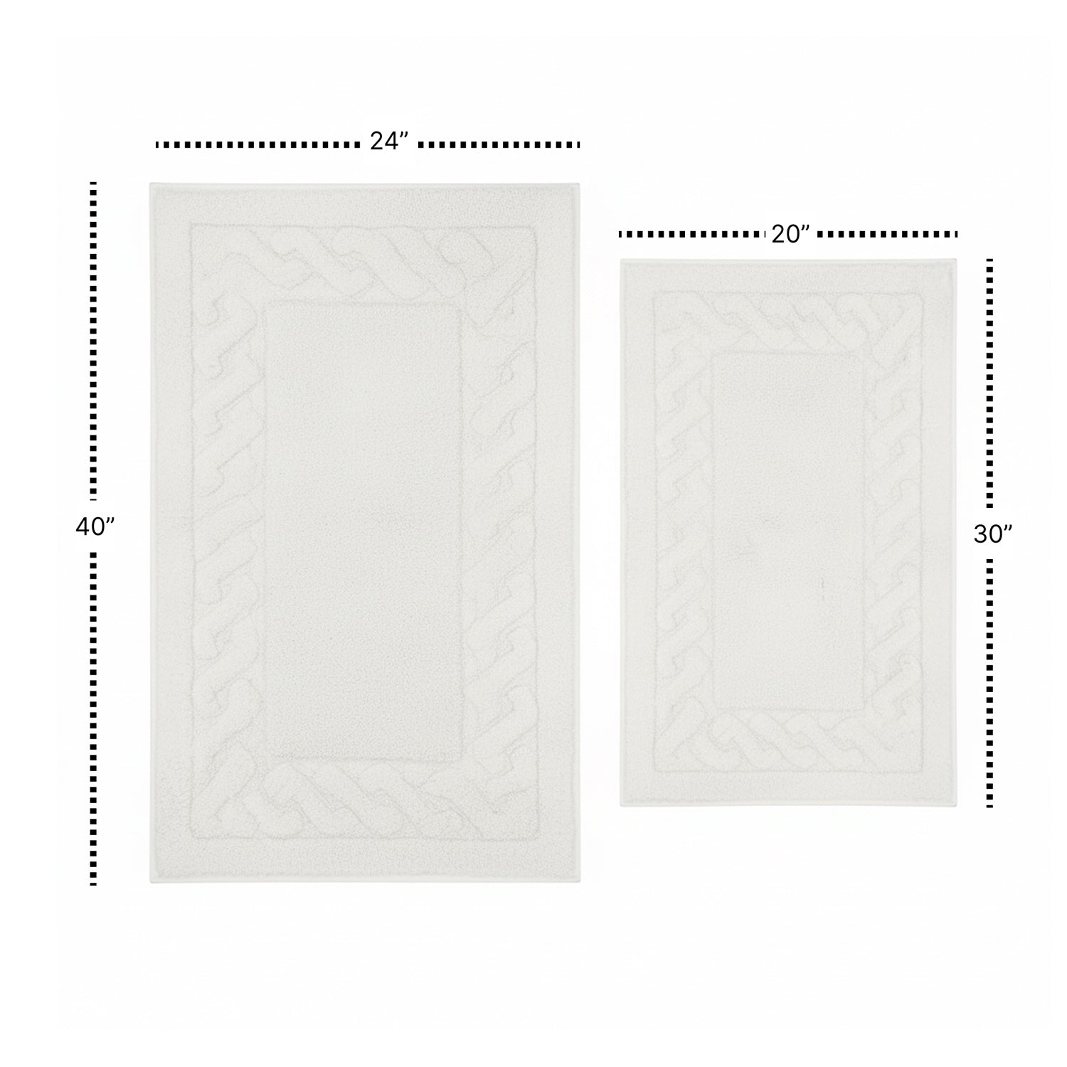 Classic Elegance With Knightsbridge White Chain Design: Add a touch of sophistication to your bathroom with the Knightsbridge Stylish And Comfortable All Season Traditional Chain Design 2 PC Cotton Bath Rug Set in White. Includes 20" x 30" and 24" x 40" rugs made from premium cotton for ultimate softness and durability. The timeless chain pattern in White enhances any décor, providing a clean, elegant look. Machine-made for quality and longevity, these reversible rugs are perfect for all-season use, offering comfort, style, and easy maintenance to create a welcoming and polished bathroom environment.DURABLE MATERIAL: Premium cotton ensures the White bath rugs 20" x 30" and 24" x 40" are soft yet strong, maintaining their plush feel and classic chain design while withstanding daily use and frequent washing. INCLUDING ITEMS: Set includes two rugs, 20" x 30" and 24" x 40" in White, providing coordinated style, enhanced comfort, and warmth for your bathroom floor, perfect for everyday use. VERSATILE DESIGN: Classic chain pattern in White offers an elegant, timeless aesthetic, easily complementing modern, traditional, or transitional bathroom décor while providing practical comfort. REVERSIBLE STYLE: Both sides deliver the same luxurious texture and design, allowing reversible use to extend the life of your White rugs while keeping the pattern fresh and evenly worn. EASY MAINTENANCE: Machine washable, these White rugs maintain their softness, color, and texture even after repeated washing, ensuring hassle-free upkeep while remaining stylish and functional.