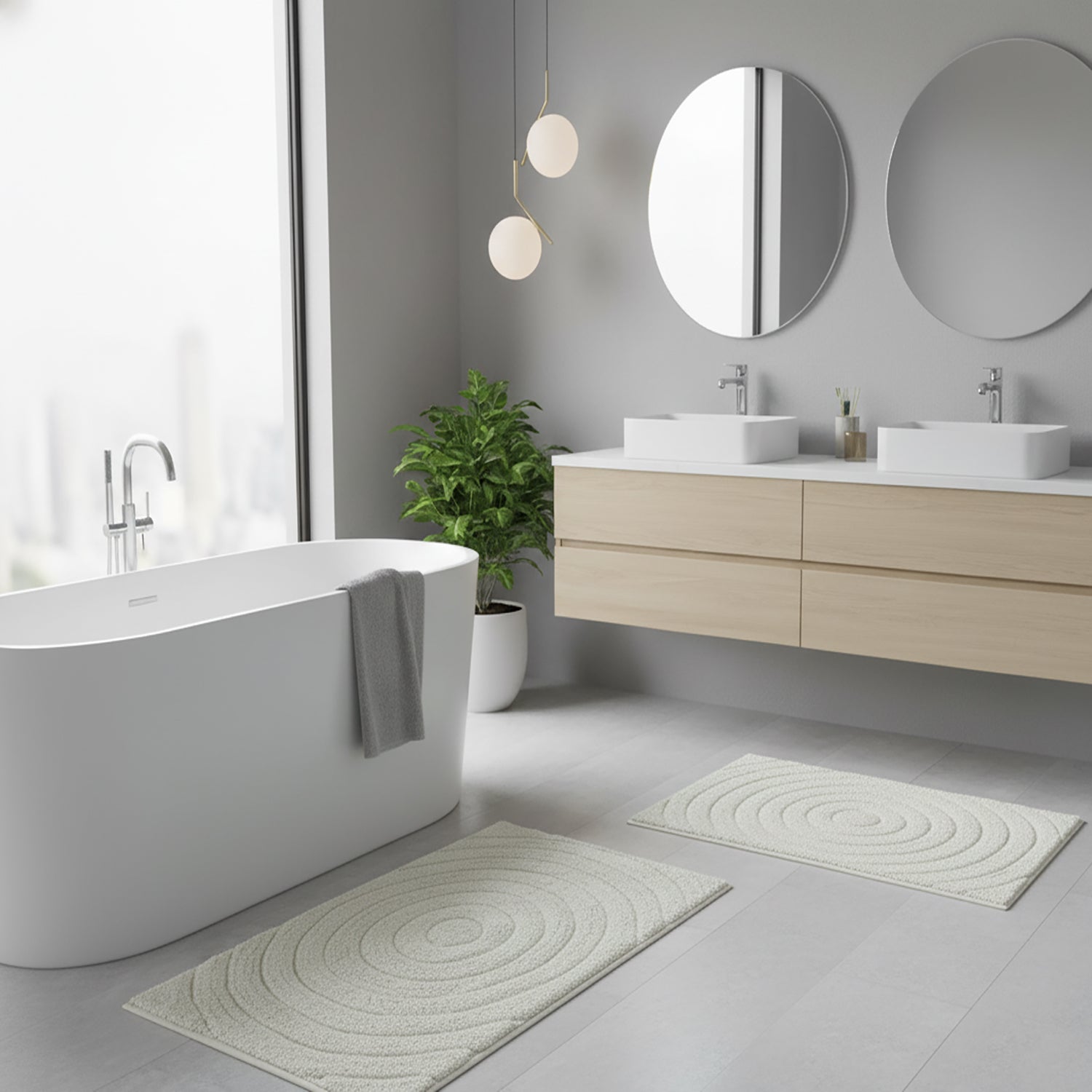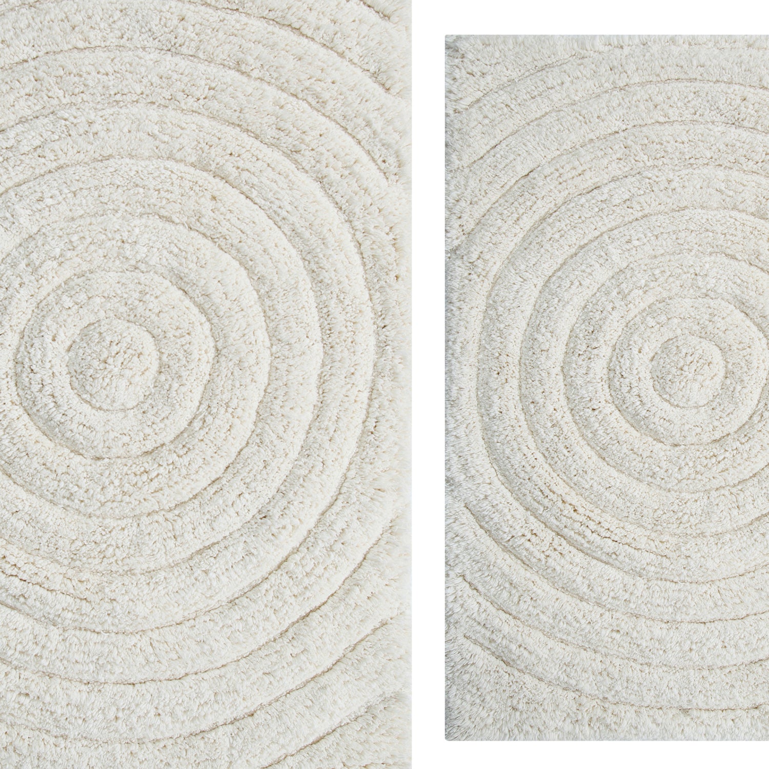 Enhance Your Bathroom With Knightsbridge Stylish And Comfortable All Season Traditional Echo Design 2 PC Cotton Bath Rug Set In Ivory Color Featuring Plush Cotton And Dimensions Of 20" X 30" And 24" X 40", Combining Refined Style With Everyday Comfort. The echo design provides subtle texture, elevating the bathroom décor while soft, absorbent cotton cushions your feet. Machine-made for durability, this rug set remains plush and resilient for all-season use, offering elegant, functional comfort for all ages. Perfect for adding warmth and sophistication to any bathroom.DURABLE MATERIAL:: Made from premium cotton, this Ivory 20" x 30" & 24" x 40" rug set offers long-lasting durability, plushness, and absorbency, retaining softness and color even after repeated use. INCLUDING ITEMS:: Includes two rugs, one 20" x 30" and one 24" x 40" in Ivory, providing coordinated coverage for tub fronts, floors, and vanity areas with cushioned comfort. VERSATILE DESIGN:: Echo pattern in Ivory adds a classic, sophisticated touch to bathroom interiors, complementing modern or traditional decor while offering a soft surface for everyday use. REVERSIBLE STYLE:: Fully reversible design ensures plush surfaces on both sides, providing flexible placement and prolonging the lifespan of your rug set while maintaining comfort. EASY MAINTENANCE:: Machine washable and quick-drying, these Ivory cotton rugs maintain absorbency, softness, and color vibrancy, allowing effortless cleaning and long-term use.