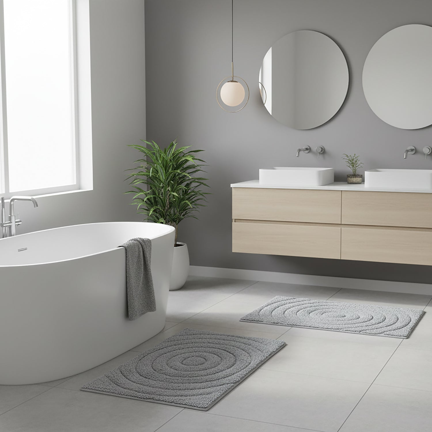 Knightsbridge Stylish And Comfortable All Season Traditional Echo Design 2 PC Cotton Bath Rug Set 20" X 30" & 24" X 40" Silver brings a perfect blend of luxury, softness, and practicality to your bathroom. The durable cotton construction ensures long-lasting comfort, while the elegant silver hue complements any décor style seamlessly. Machine made for precision and consistency, these rugs provide excellent absorbency, a soft plush feel underfoot, and are ideal for year-round use. Easy to maintain, this set keeps your bathroom inviting, fresh, and stylish with its all-season versatility and premium design.DURABLE MATERIAL: Crafted from high-quality cotton, this 2 PC bath rug set in Silver with sizes 20" X 30" & 24" X 40" offers long-lasting durability, maintaining softness and plush comfort even with frequent use. INCLUDING ITEMS: This set includes two bath rugs: a smaller 20" X 30" and a larger 24" X 40" piece, both in elegant Silver, providing complete coverage for your bathroom floor and enhancing overall décor aesthetics. VERSATILE DESIGN: Designed to complement various bathroom styles, the traditional Echo pattern in Silver fits contemporary, classic, or transitional spaces while providing a cozy and inviting feel underfoot. REVERSIBLE STYLE: Both rugs are designed with a reversible construction in Silver, allowing for easy flipping to extend the life of the rugs while keeping your bathroom stylish and uniformly attractive. EASY MAINTENANCE: Machine washable and easy to care for, the Silver rugs retain their softness, color, and plush texture even after repeated washes, making them practical and convenient for everyday use.