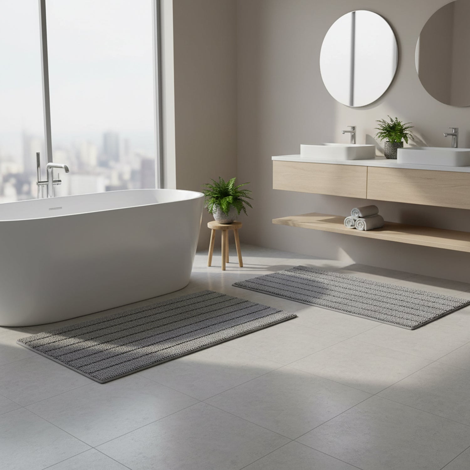 The Knightsbridge Linear Bath Rug Set in modern Silver adds a polished touch to your space. Made from 100% cotton, the two rugs (20" x 30" and 24" x 40") feature a soft, dense pile that provides warmth and comfort underfoot. The reversible design ensures double-sided plushness, extending usability. Non-skid backing prevents slipping for safe use on smooth bathroom floors. The Silver tone enhances contemporary interiors while complementing a wide color palette. Machine washable and durable, this set blends functionality, softness, and timeless appeal—perfect for refreshing your bathroom décor.DURABLE MATERIAL: Premium 100% cotton fibers form a soft, thick pile with superior absorption and resilience. The non-slip base offers reliable traction, making this Silver rug set a perfect blend of comfort and stability. INCLUDING ITEMS: Includes two Silver bath rugs sized 20" x 30" and 24" x 40". Their balanced dimensions fit key areas while maintaining a cohesive, elegant appearance that enhances your overall bathroom layout. VERSATILE DESIGN: The sleek Silver shade introduces refined elegance to both minimalist and modern spaces. The simple striped texture complements your décor while reflecting subtle light beautifully. REVERSIBLE STYLE: Each rug offers plush comfort on both sides for extended life and fresh appearance. Flip regularly for even wear and consistent luxury through every season. EASY MAINTENANCE: Machine washable and easy to care for—just wash cold and tumble dry low. The durable cotton retains its soft Silver tone and absorbent quality even after many laundry cycles.