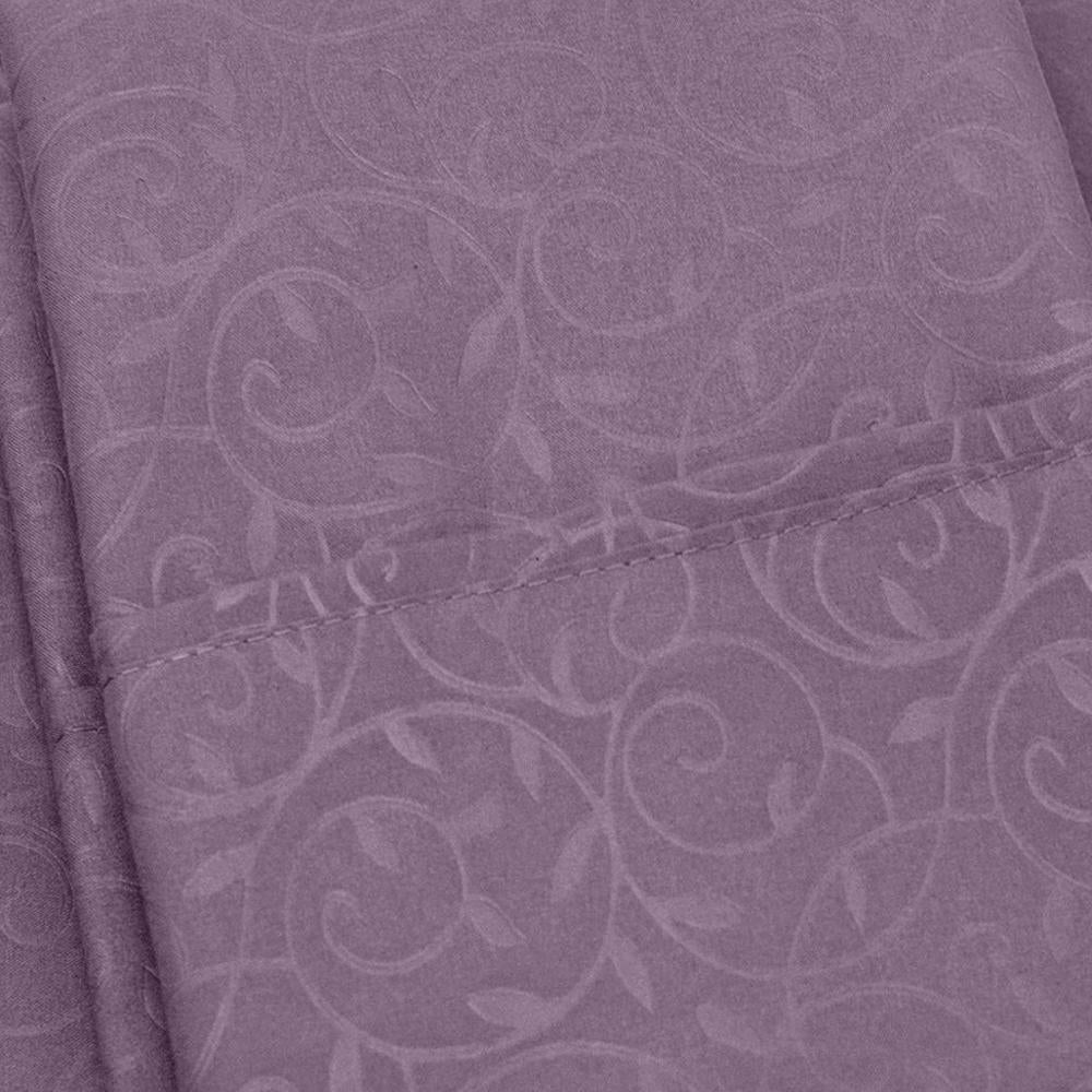 Twin - Flat 66x96, Fitted 39x75x14, One Pillowcase 20x30. Full - Flat 81x96, Fitted 54x75x14, Two Pillowcases 20x30. Queen - Flat 90x102, Fitted 60x80x16, Two Pillowcases 20x30. King - Flat 108x102, Fitted 78x80x16, Two King Pillowcases 20x40. 100% Brushed Polyester Microfiber. 90 GSM. Wrinkle-free material. Easy care - machine washable. Soft and light feel fabric. Purple color.Most sophisticated caliber microfiber sheets. These super soft sheet will make you dream of your bed. . Vine print adds an elegant touch. Fully elasticated fitted sheet 100% Brushed Polyester Microfiber. 90 GSM. Wrinkle-free material Easy care - machine washable