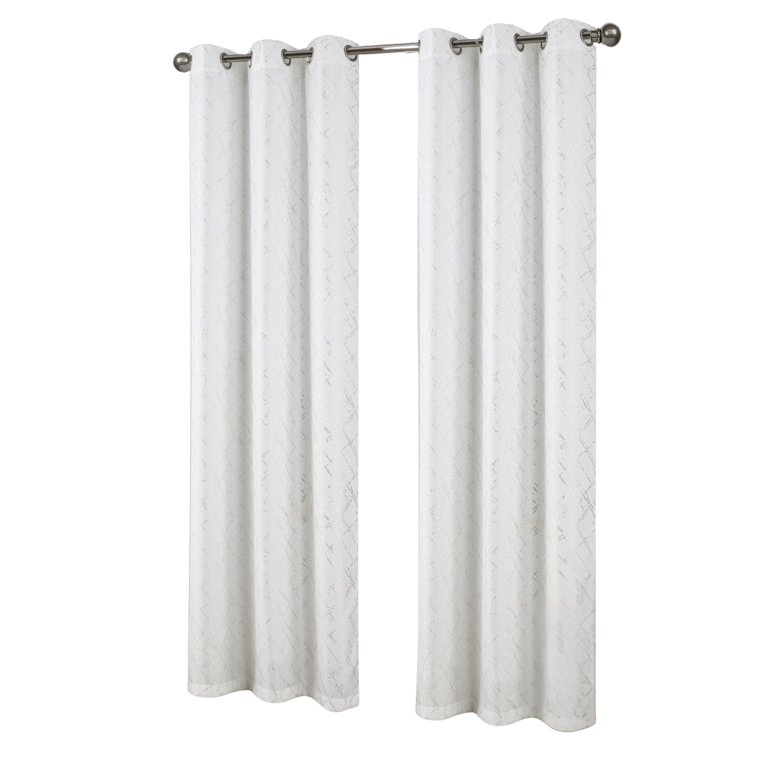 Elevate your space with the Soho Foil Jacquard Window Curtain Set in Silver. Highlighted by a bold geometric squares jacquard design with shimmering metallic foil accents, these curtains provide a sleek, modern update with reflective sophistication. Each set contains two panels, each 36" x 84", made from durable 100% polyester for soft draping and long-lasting quality. Built-in grommets make installation quick and smooth, allowing easy movement on any standard rod. The silver fabric paired with metallic highlights brings dimension and light to your interiors, making these curtains a striking choice for living rooms, bedrooms, or dining areas. Designed to balance functionality with style, the Soho Silver curtains add depth and texture while complementing modern décor. Fully machine washable, they are convenient to maintain and designed to stay fresh and elegant with little effort.DURABLE MATERIAL: Woven from 100% polyester, these curtains are designed to last, combining strength, soft drape, and resistance to everyday wear for a sleek and reliable window treatment. INCLUDING ITEMS: Each package includes two curtain panels, each 36" wide by 84" long, offering a complete set to style and cover standard windows with a coordinated, modern finish. VERSATILE DESIGN: The geometric jacquard squares pattern with metallic foil accents adds a contemporary edge, making these curtains ideal for modern bedrooms, living rooms, or offices. REVERSIBLE STYLE: The foil-enhanced jacquard fabric provides a bold decorative face with a clean reverse side, giving flexibility to coordinate with various décor styles and window settings. EASY MAINTENANCE: Crafted for convenience, these machine washable curtains are easy to clean and maintain, ensuring they retain their beauty and shine with minimal effort over time.