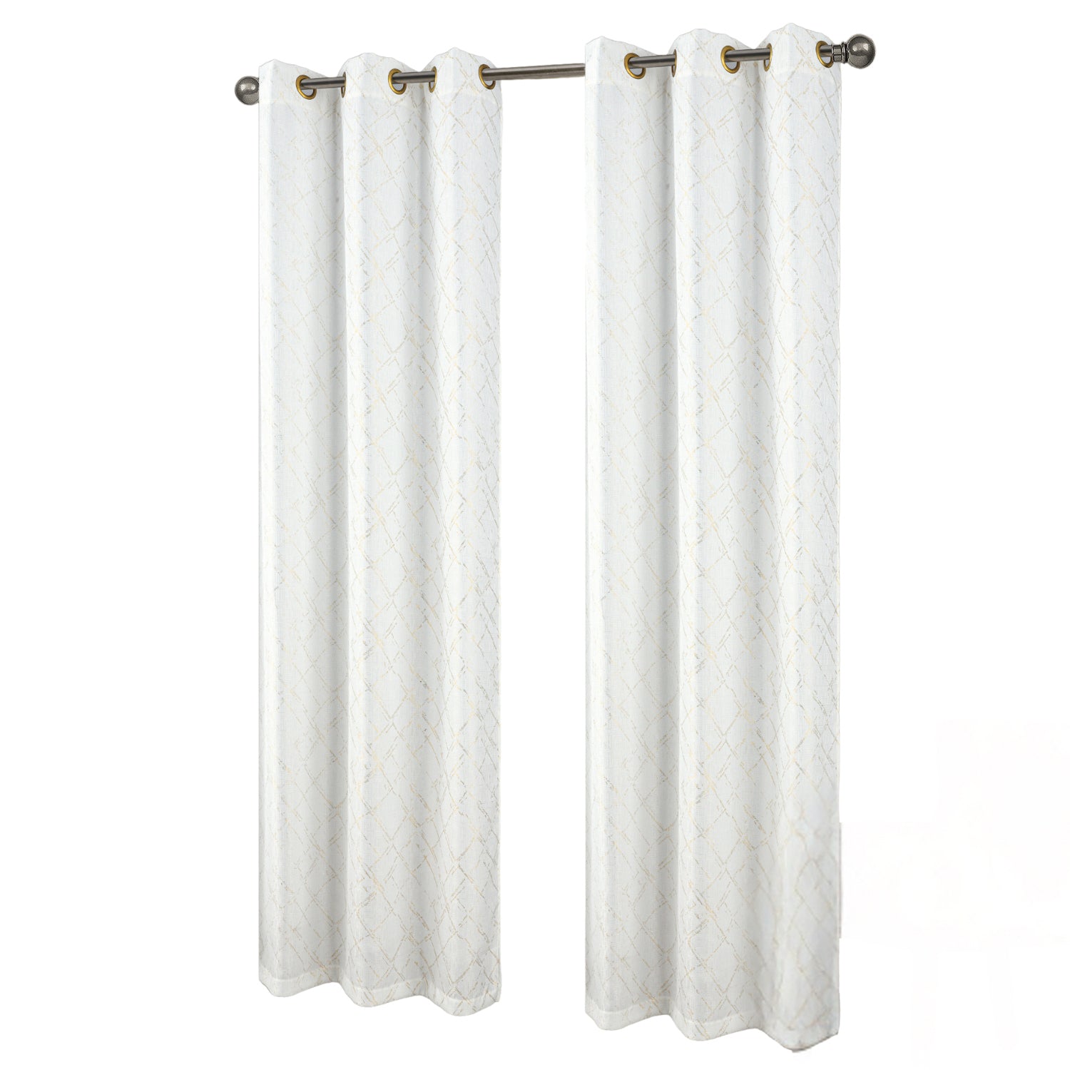Bring a touch of contemporary glamour into your home with the Soho Foil Jacquard Window Curtain Set in White/Gold. Featuring a bold geometric squares jacquard design enhanced with shimmering gold foil, these curtains create a stunning balance of modern style and timeless warmth. Each set includes two panels, each measuring 36" x 84", made of 100% polyester for strength and soft draping. Built-in grommets allow for fast hanging and easy sliding on any standard curtain rod. The crisp white fabric with golden highlights reflects light beautifully, adding elegance to bedrooms, dining areas, or living rooms. Designed to complement a variety of interiors, the Soho White/Gold curtains provide depth, shine, and versatility. Easy to care for and fully machine washable, this set combines durability, contemporary charm, and convenience in one package.DURABLE MATERIAL: Woven from 100% polyester, these curtains are designed to last, combining strength, soft drape, and resistance to everyday wear for a sleek and reliable window treatment. INCLUDING ITEMS: Each package includes two curtain panels, each 36" wide by 84" long, offering a complete set to style and cover standard windows with a coordinated, modern finish. VERSATILE DESIGN: The geometric jacquard squares pattern with metallic foil accents adds a contemporary edge, making these curtains ideal for modern bedrooms, living rooms, or offices. REVERSIBLE STYLE: The foil-enhanced jacquard fabric provides a bold decorative face with a clean reverse side, giving flexibility to coordinate with various décor styles and window settings. EASY MAINTENANCE: Crafted for convenience, these machine washable curtains are easy to clean and maintain, ensuring they retain their beauty and shine with minimal effort over time.