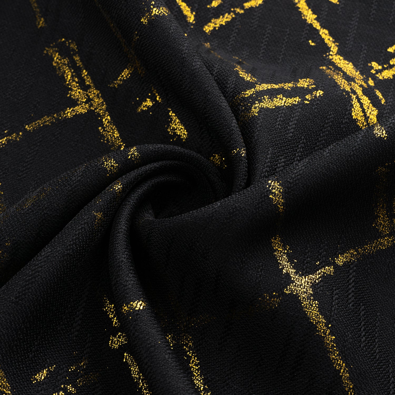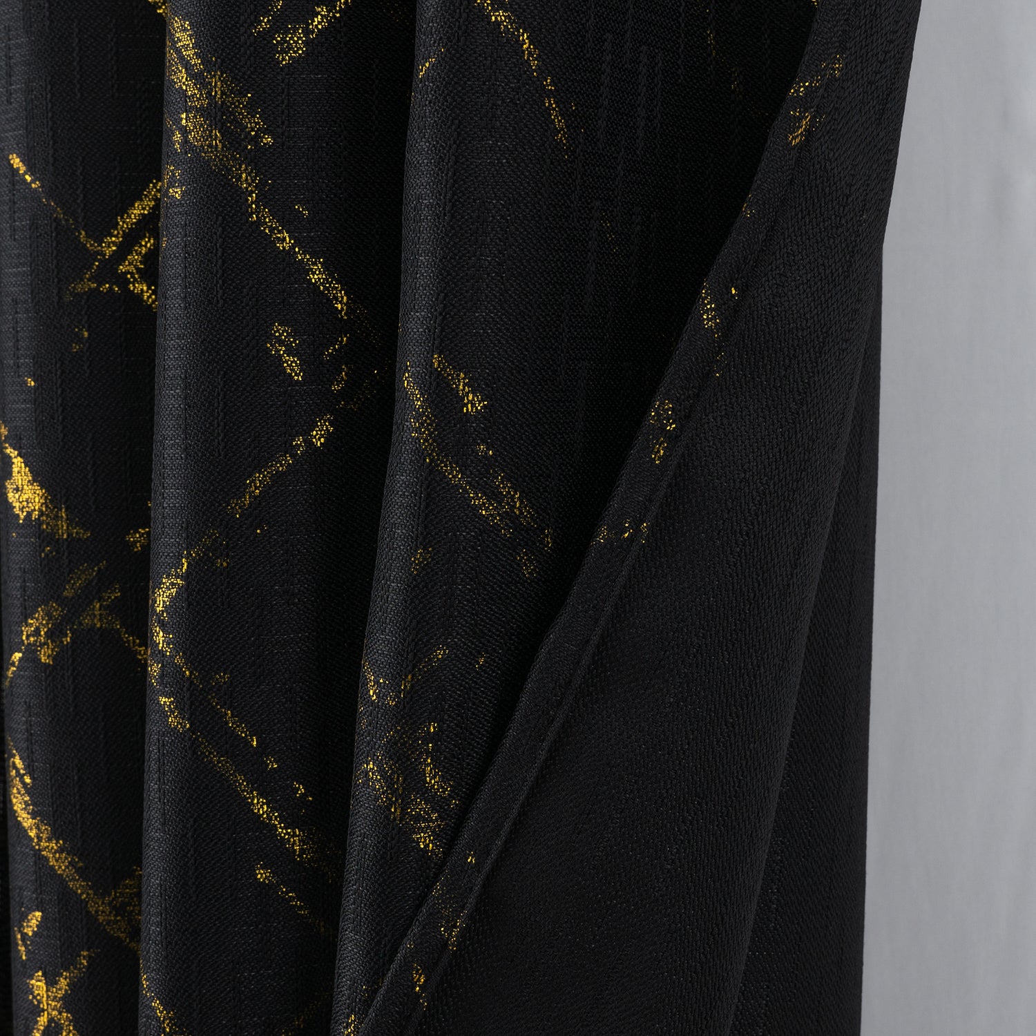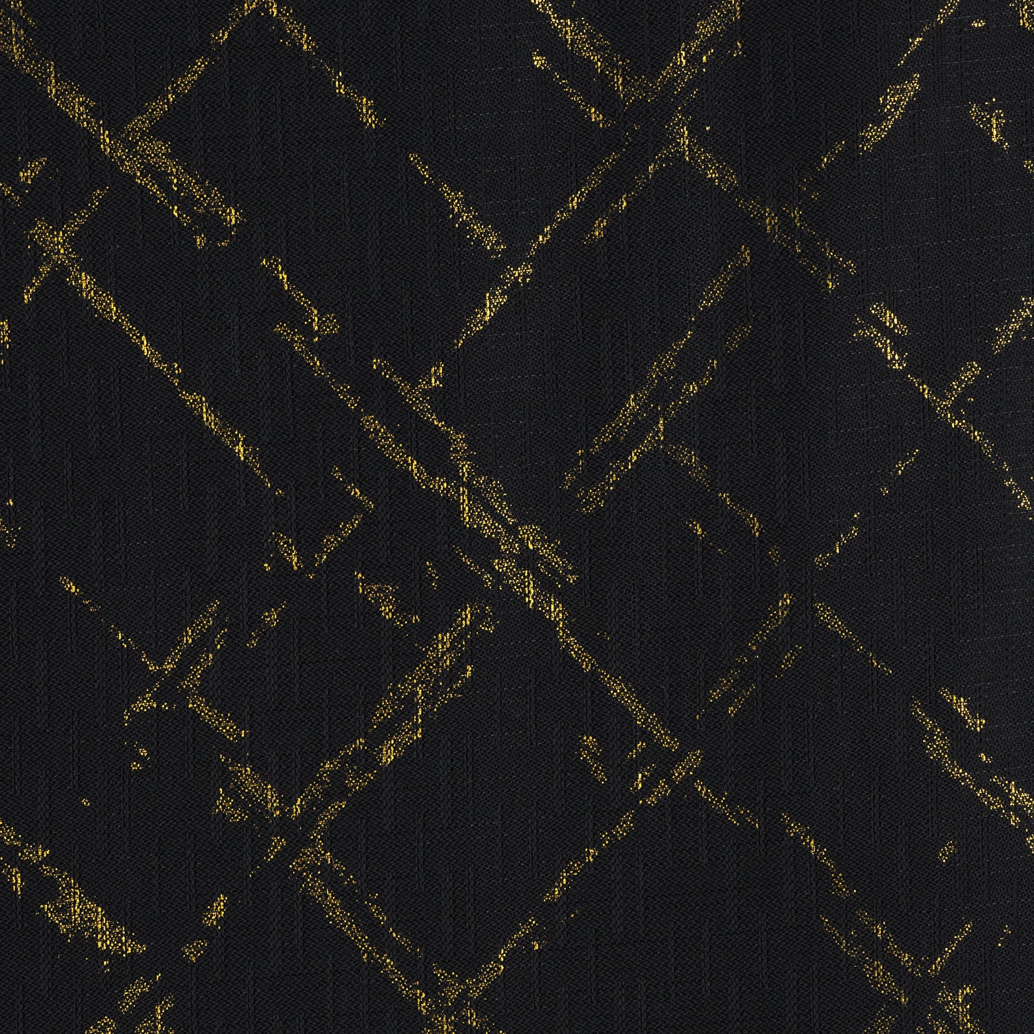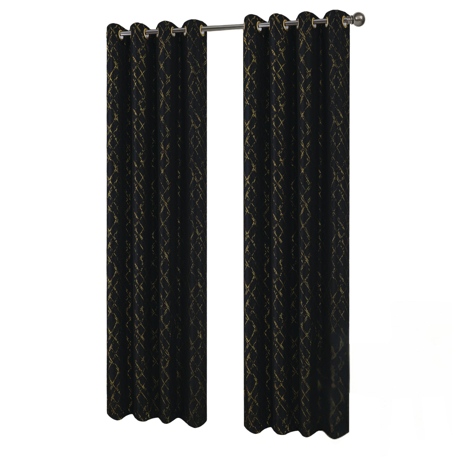 Elevate your home décor with the sleek, contemporary appeal of the Soho Foil Jacquard Grommet Panel in Black. Designed to make a bold statement, this single curtain panel features a striking geometric squares pattern enhanced with a shimmering metallic foil print, adding depth, shine, and sophistication to any space. Perfectly sized at 52" x 90", it is tailored for larger windows, offering full coverage and a dramatic drop that enhances modern living rooms, bedrooms, or dining areas. The built-in metal grommets ensure easy installation, allowing the panel to glide smoothly onto any standard curtain rod. Crafted from high-quality 100% polyester, it offers long-lasting durability and a soft drape, blending style with function. Whether used as a standalone accent or paired for complete window dressing, the Soho Foil Jacquard Panel in Black transforms your interiors with effortless elegance, adding both privacy and a designer-inspired finishing touch.DURABLE MATERIAL: Made from 100% premium polyester, this jacquard curtain panel ensures strength, resilience, and a soft, flowing drape that complements modern interiors while offering long-lasting daily performance. INCLUDING ITEMS: Single curtain panel measuring 52" x 90" is included. Ideal for larger windows, it provides stylish coverage and can be paired with additional panels for a more dramatic layered look. VERSATILE DESIGN: Featuring a bold geometric squares design with a metallic foil finish, this curtain panel brings modern sophistication and contemporary flair to living rooms, bedrooms, or dining spaces. REVERSIBLE STYLE: Jacquard weave with foil accents ensures an elegant look on both sides, making the panel versatile and polished when viewed from inside your home or from the exterior. EASY MAINTENANCE: Designed for convenience, this curtain panel is machine washable, retaining its shimmer and texture even after repeated cleaning, making it both stylish and practical.