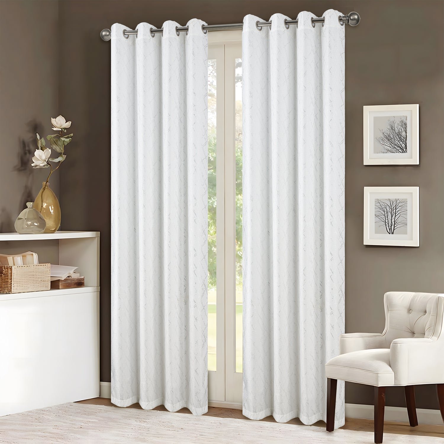 Elevate your home décor with the sleek, contemporary appeal of the Soho Foil Jacquard Grommet Panel in White/Silver. Designed to make a bold statement, this single curtain panel features a striking geometric squares pattern enhanced with a shimmering metallic foil print, adding depth, shine, and sophistication to any space. Perfectly sized at 52" x 90", it is tailored for larger windows, offering full coverage and a dramatic drop that enhances modern living rooms, bedrooms, or dining areas. The built-in metal grommets ensure easy installation, allowing the panel to glide smoothly onto any standard curtain rod. Crafted from high-quality 100% polyester, it offers long-lasting durability and a soft drape, blending style with function. Whether used as a standalone accent or paired for complete window dressing, the Soho Foil Jacquard Panel in Black transforms your interiors with effortless elegance, adding both privacy and a designer-inspired finishing touch.DURABLE MATERIAL: Made from 100% premium polyester, this jacquard curtain panel ensures strength, resilience, and a soft, flowing drape that complements modern interiors while offering long-lasting daily performance. INCLUDING ITEMS: Single curtain panel measuring 52" x 90" is included. Ideal for larger windows, it provides stylish coverage and can be paired with additional panels for a more dramatic layered look. VERSATILE DESIGN: Featuring a bold geometric squares design with a metallic foil finish, this curtain panel brings modern sophistication and contemporary flair to living rooms, bedrooms, or dining spaces. REVERSIBLE STYLE: Jacquard weave with foil accents ensures an elegant look on both sides, making the panel versatile and polished when viewed from inside your home or from the exterior. EASY MAINTENANCE: Designed for convenience, this curtain panel is machine washable, retaining its shimmer and texture even after repeated cleaning, making it both stylish and practical.