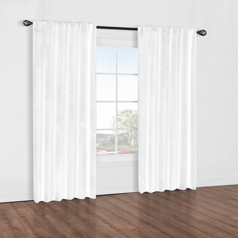 This collection by Thermaplus is a textured contemporary solid color curtain designed to bring a classic touch to any room. Its thermal backing is constructed of multiple bonded layers of foam developed to create a hotel quality 100% true, total blackout environment. Also providing absolute privacy, heating and cooling cost-cutting benefits, as well as sound dampening. The 84-inch length of this curtain is best suited for rooms where you either need the curtain a few inches off the floor or are dealing with lower ceilings. This curtain is made from quality materials and is long-lasting, easy to clean, and resists wrinkling. Includes one curtain panel. Available size: 52x84" and 52x95". Color: White.Baxter Total Blackout Back Tab Curtain - Available size: 52x84" and 52x95", Color: White The product will block 100% of all incoming light and provide 100% true blackout experience Total blackout environment also providing absolute privacy, heating cooling and sound dampening Insulated and energy efficient back tab curtain panel, tailored look Gentle cycle, Hang to dry